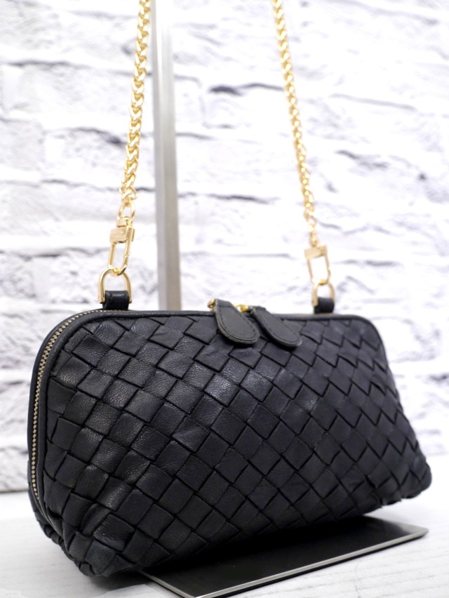 ◆BOTTEGA VENETA ボッテガヴェネタ イントレチャート クロスボディ レザー ショルダー ミニ バッグ ポーチ ポシェット 黒x金◆ 希少モデル