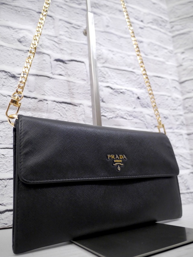 PRADA(プラダ) SAFFIANO サフィアーノ レザー クロスボディ レザー ショルダー ウォレット クラッチ バッグ オーガナイザー 長財布です。 お馴染みのサフィアーノレザーにゴールドの【PRADA】ロゴがさりげなく主張する定番人気モデルです。です。 サフィアーノレザーを採用したことで高級感が漂い、さりげないコーディネートのワンポイントにもピッタリだと思います。 オーガナイザーウォレットなので通常の長財布よりも大きめのサイズ感で、スマホなどもスッポリと収まり、クラッチバッグやパーティバッグ、バッグインバッグやポーチとしてもご使用頂け、取り外し可能な小銭入れも何かと便利な使い勝手抜群の秀逸アイテムです。 なかなか出回らないモデルなのでお探しであった方は是非ご検討ください。 ◆カラー ブラック x ゴールド ◆サイズ 横/約23cm、 縦/約13cm 、マチ/約2.5cm(※誤差はご了承願います) ◆付属品 チェーンストラップ(社外品)。 ◆状 態 7/10程度(※PRADA GINZA 購入品) ※表面に小傷、薄ら汚れ、小銭入れ内に若干のホツレ等が見られるものの、使用時に目立つようなダメージはなく中古品としての状態は良好だと思います。あくまでも中古品なので神経質な方はご遠慮下さい。