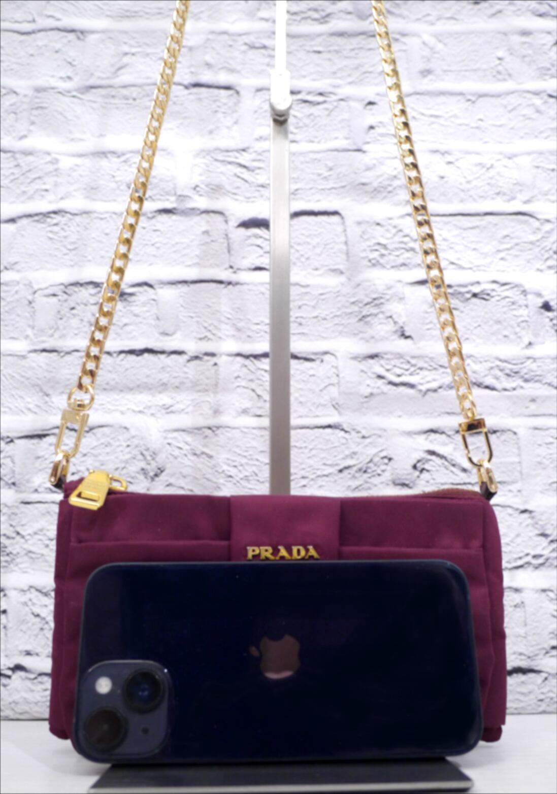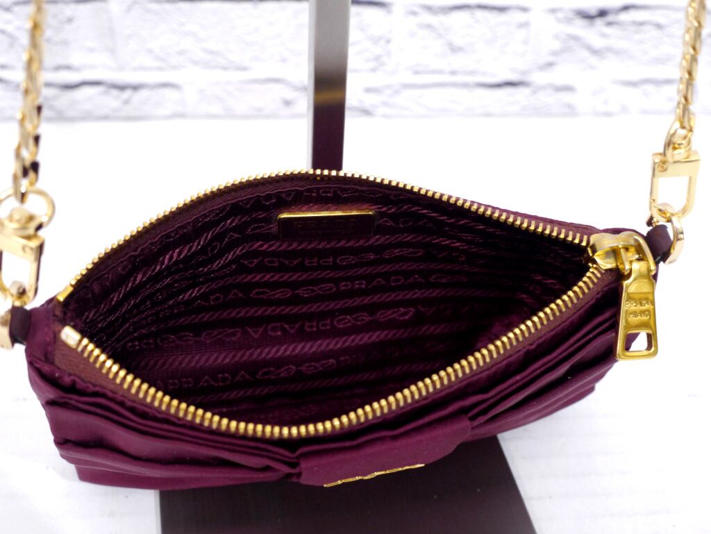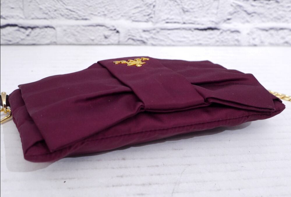 美品◆PRADA プラダ ビッグリボンデザイン ナイロン クロスボディ チェーンストラップ ショルダー バッグ ポシェット ポーチ ボルドーx金◆