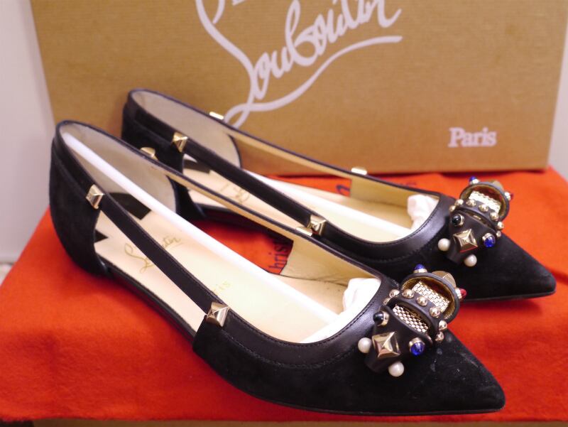 美品14.5万★ChristianLouboutin クリスチャンルブタン リボンxスタッズ装飾デザイン スエード フラット パンプス バレエシューズ 37.5 黒