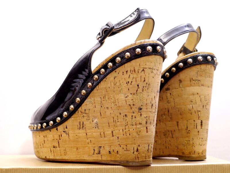 美品★ChristianLouboutin クリスチャンルブタン スタッズデザイン コルクウェッジソール パテントレザー パンプス 黒★ 春夏の定番モデル