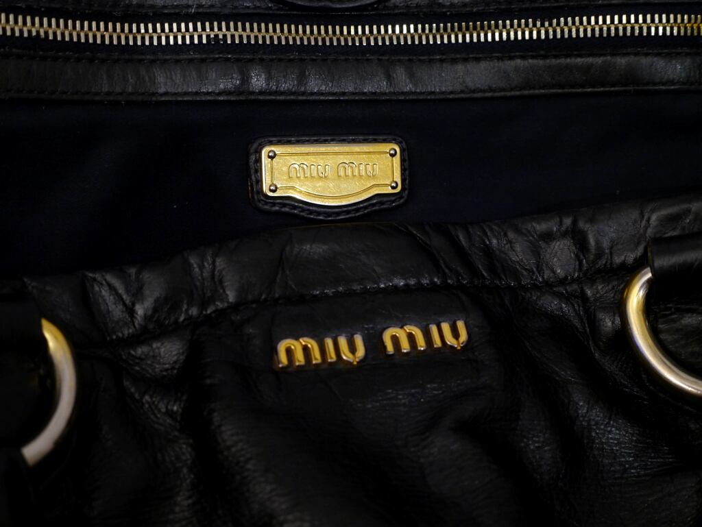 ギャザー調のブラックレザーにゴールドの【miu miu】ロゴがさりげなく主張し、シンプルで合わせやすいので通勤・通学を含めシーンを問わずに大活躍するアイテムです。
