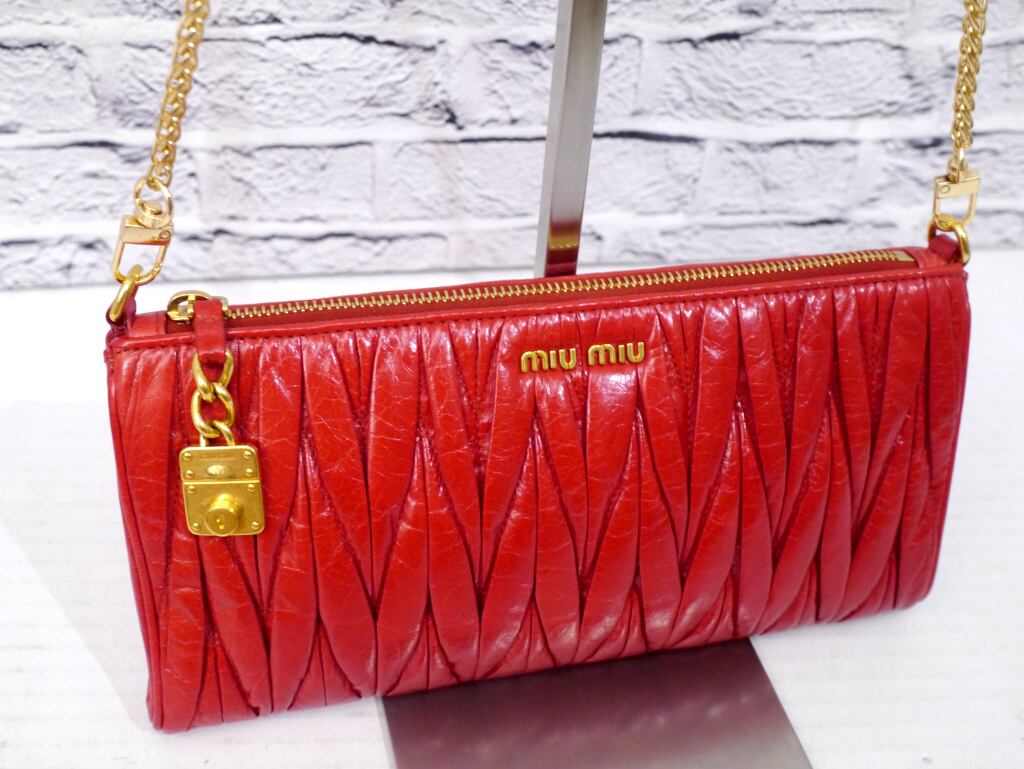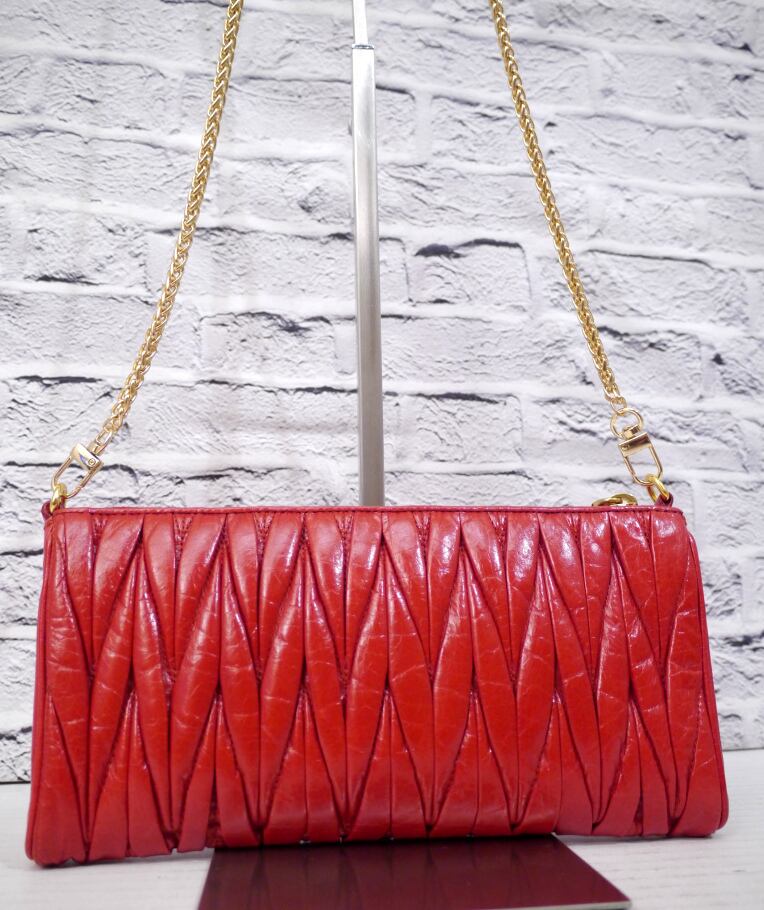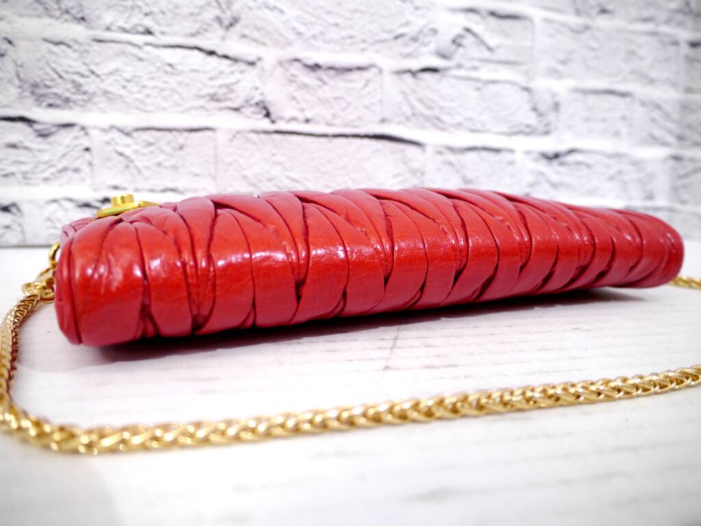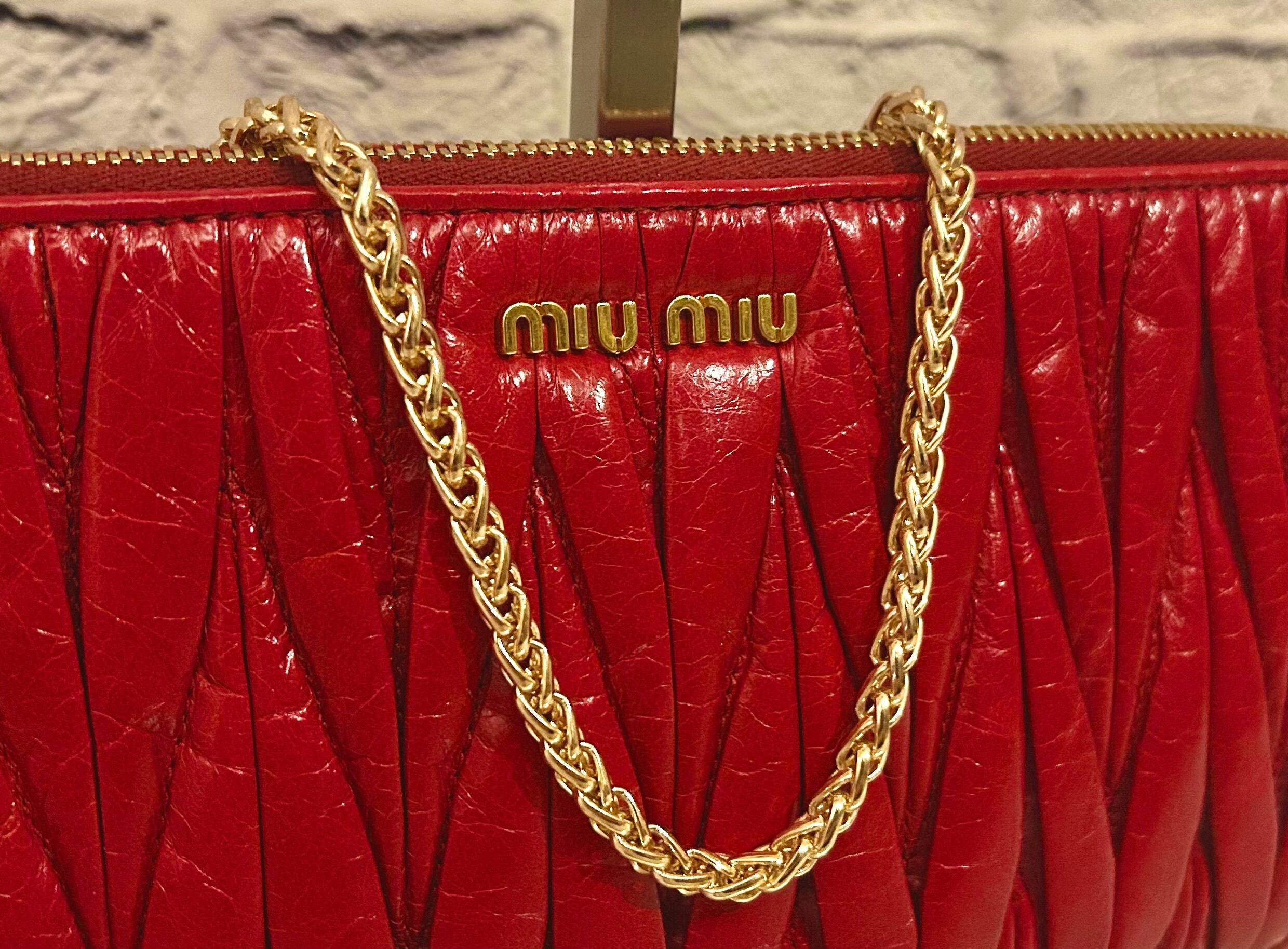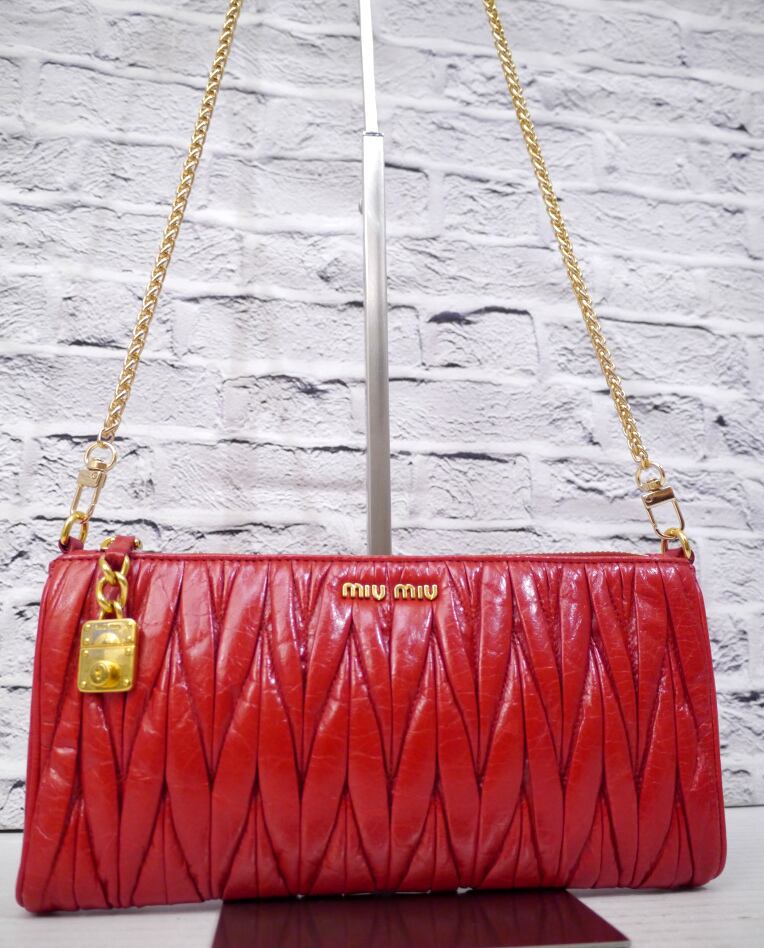 美品◆ miu miu ミュウミュウ MATELASSE マテラッセ チェーンストラップ クロスボディ レザー ショルダー クラッチ バッグ ポーチ 赤x金◆