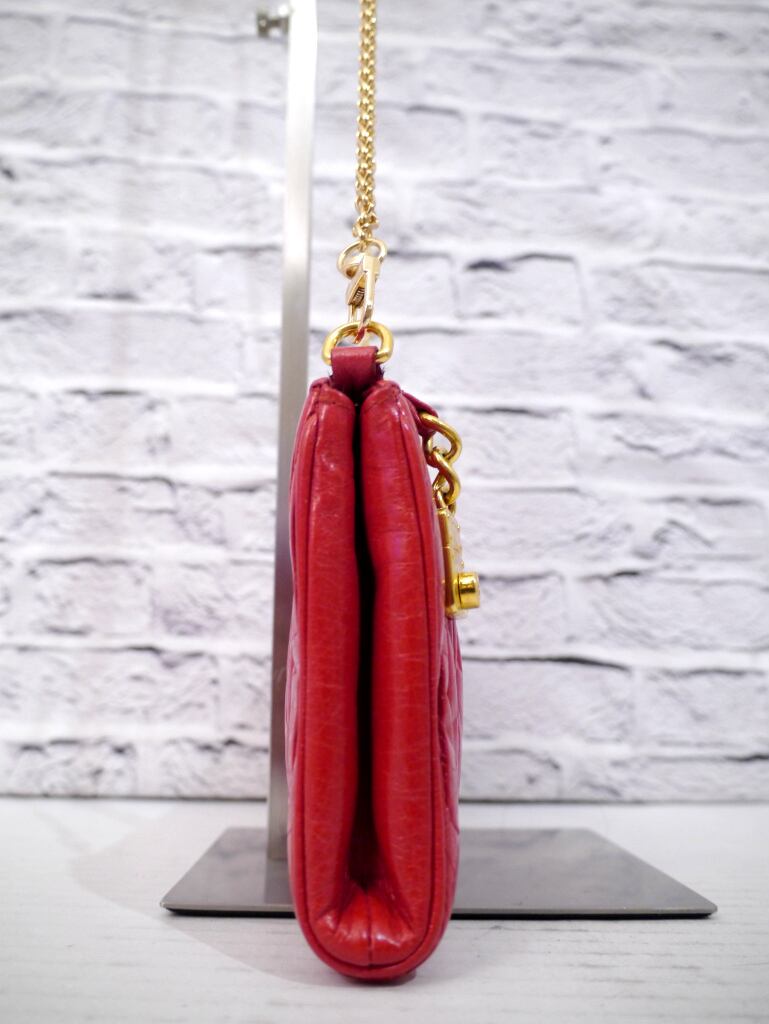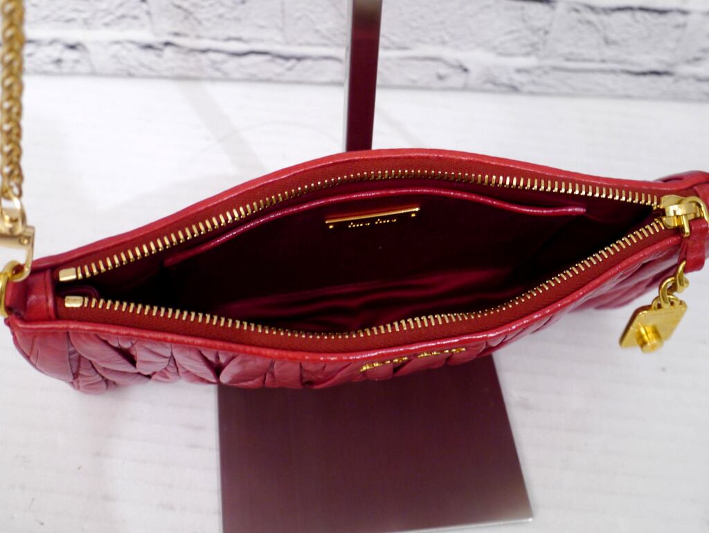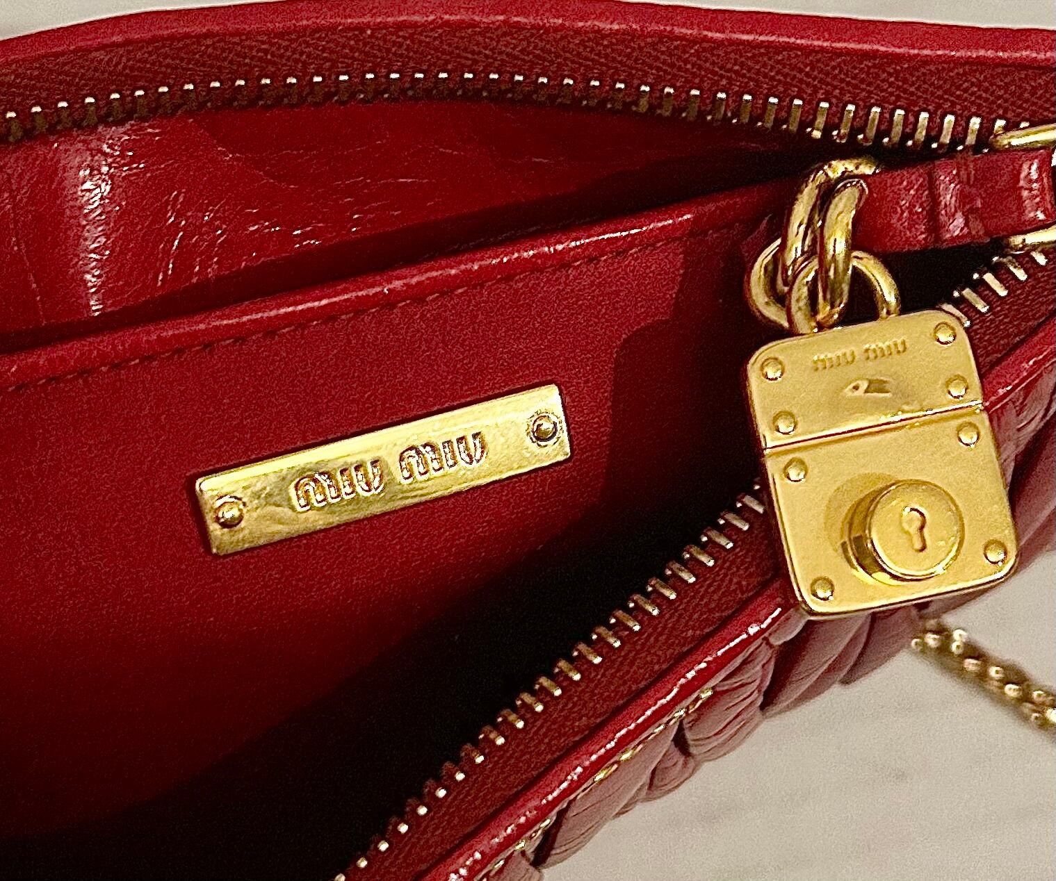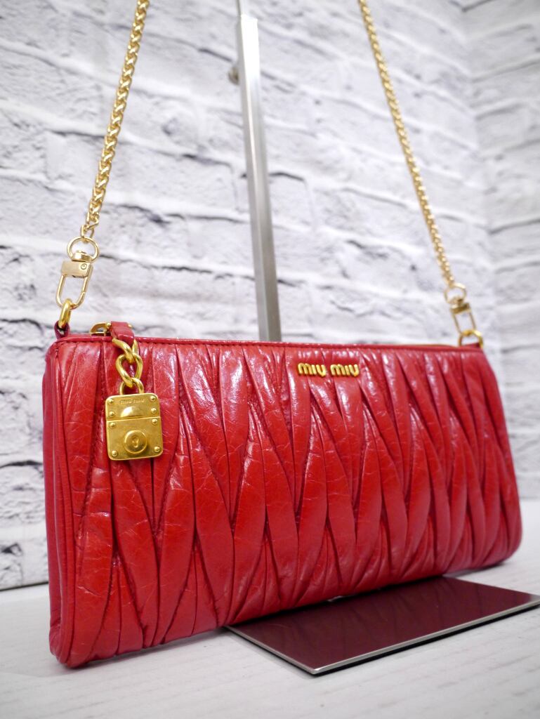 美品◆ miu miu ミュウミュウ MATELASSE マテラッセ チェーンストラップ クロスボディ レザー ショルダー クラッチ バッグ ポーチ 赤x金◆