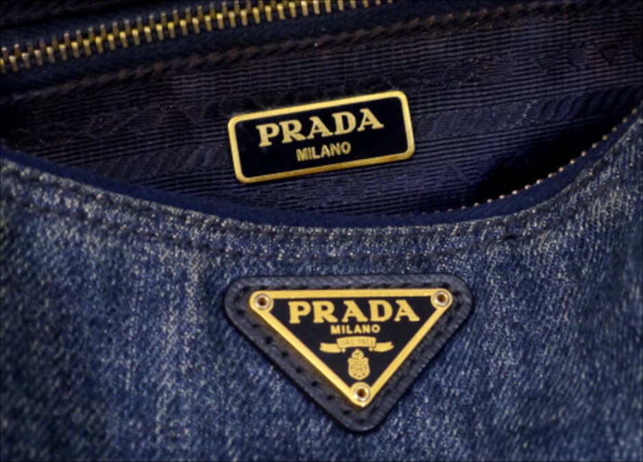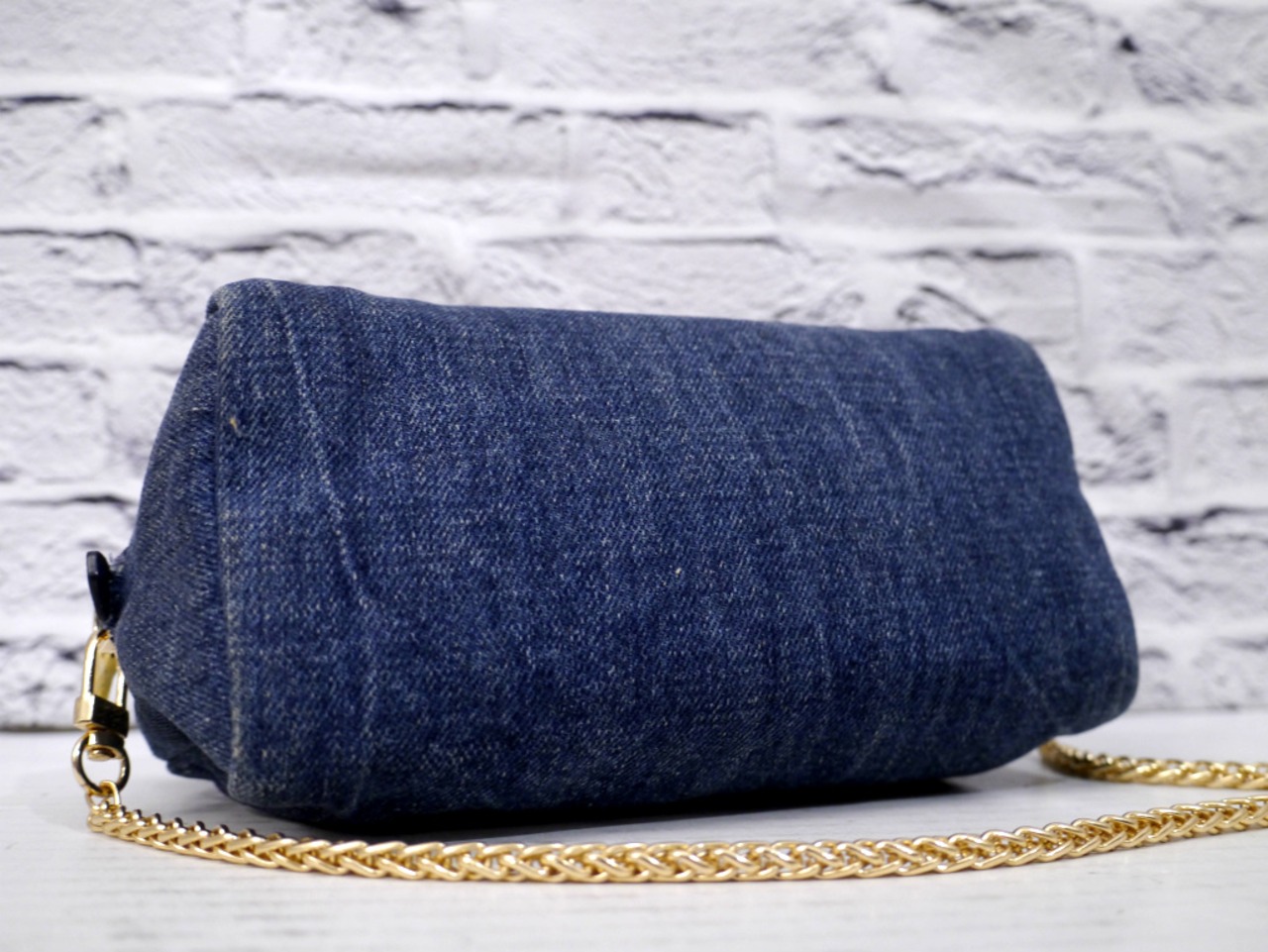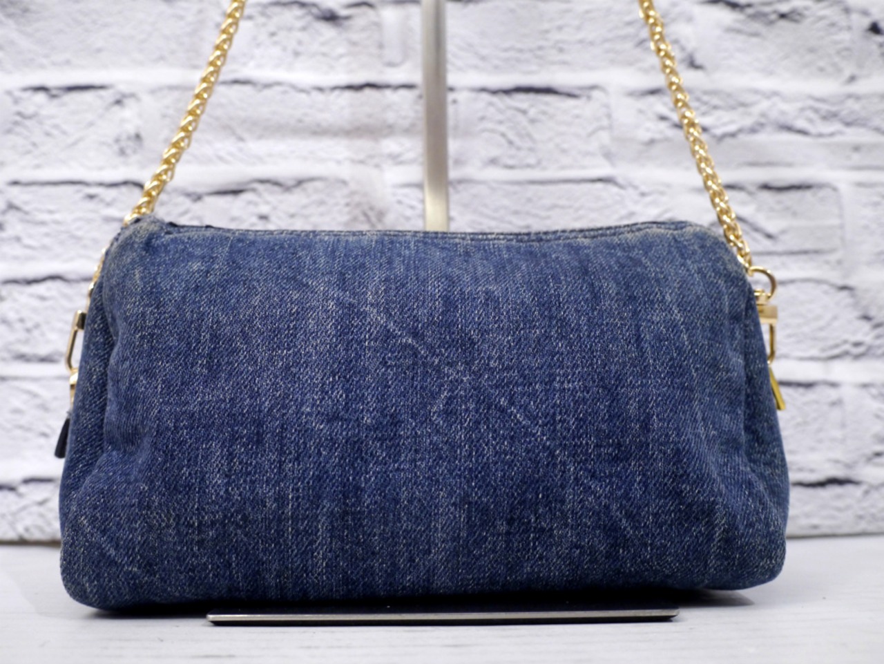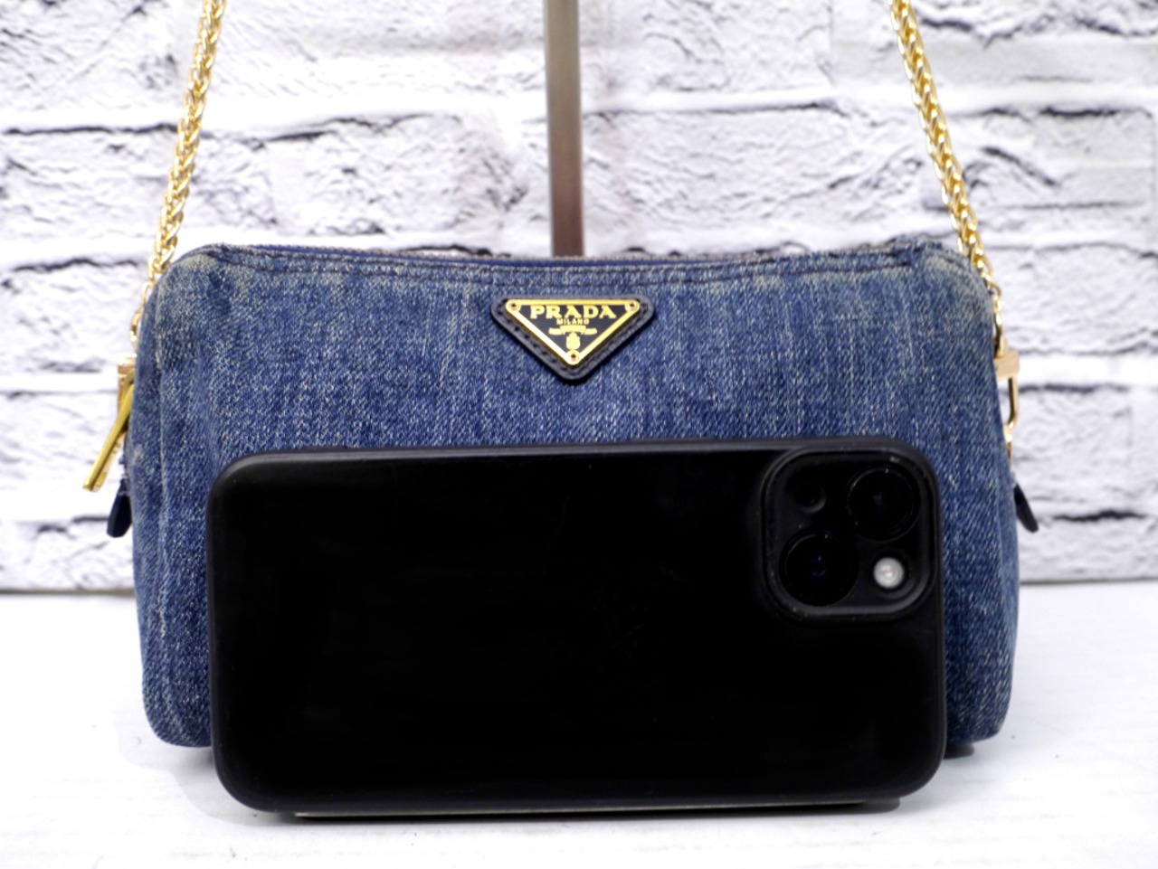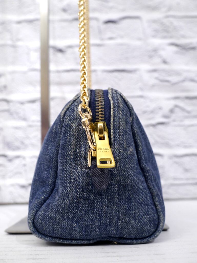 PRADAらしい上質なデニムのインディゴにゴールドの三角プレートやチェーンストラップがアクセントになったシンプルなデザインで、コーデのワンポイントとしてカジュアルにもシックにも合わせやすいアイテムです。