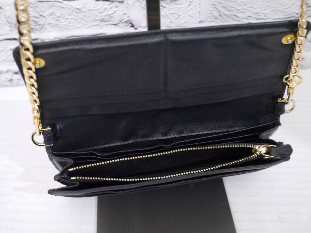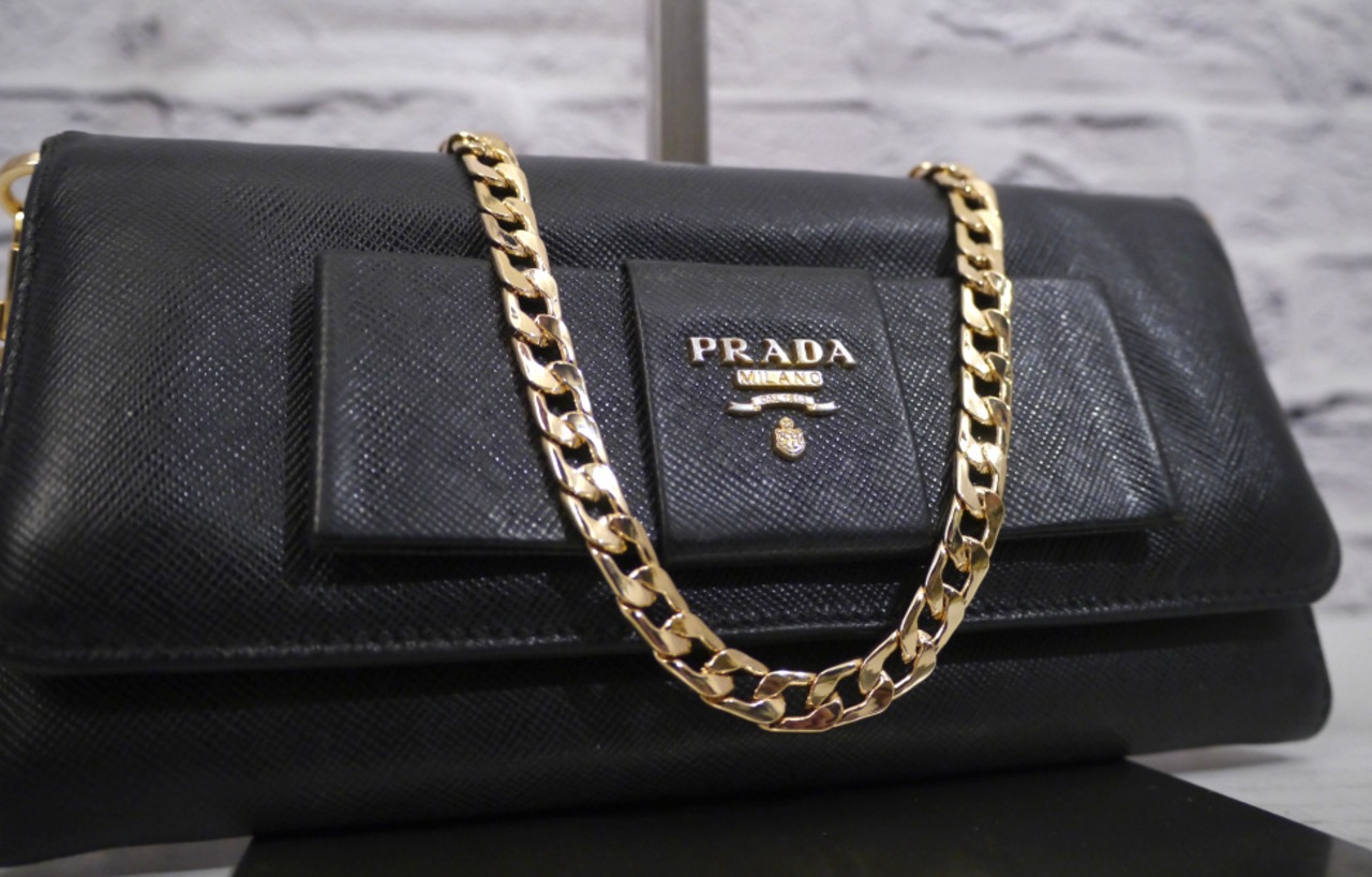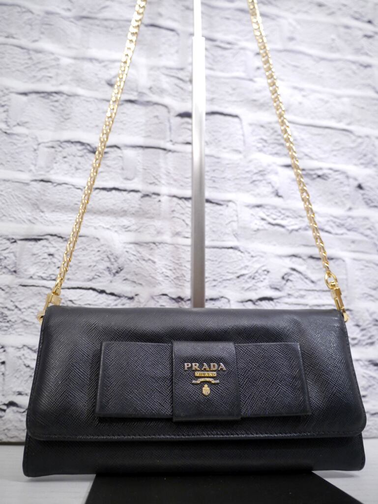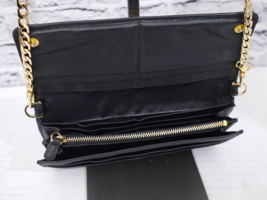 スタイリッシュなブラックのサフィアーノレザーにゴールドの【PRADA】ロゴやチェーンストラップがさりげなくが主張し、コーディネートのワンポイントにも取り入れやすいアイテムです。