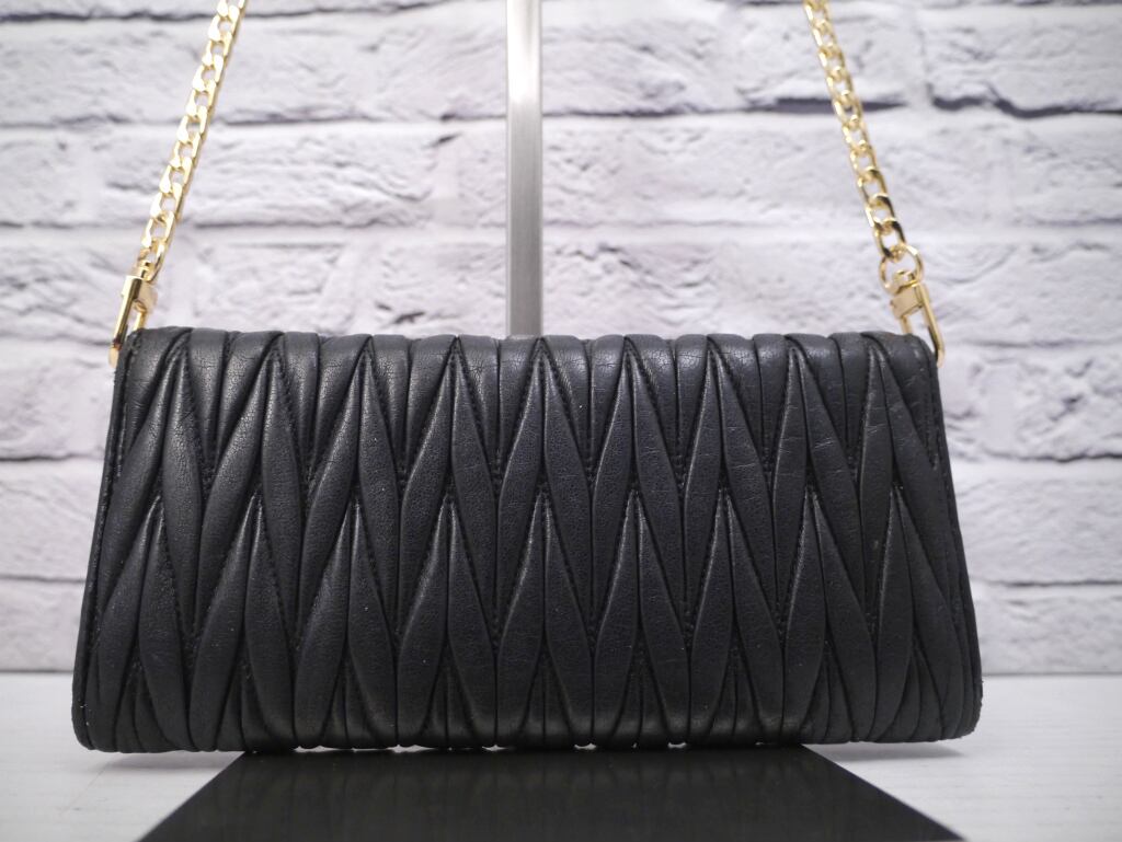 MATELASSEのギャザー感が可愛らしいブラックのレザーにゴールドの【miu miu】ロゴやチェーンストラップがさりげなくが主張し、コーディネートのワンポイントにも取り入れやすいアイテムです。