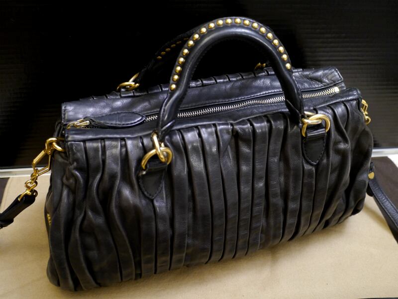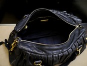 miu miu(ミュウミュウ) ギャザーデザイン スタッズハンドル ハンドショルダー2way ミニボストン型 ナッパレザー トート バッグです。