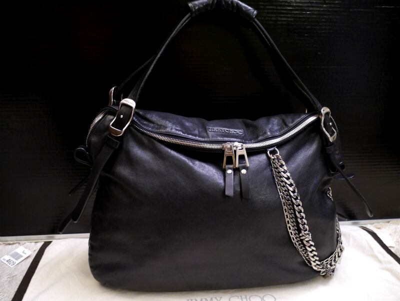 美品18万★JIMMY CHOO ジミーチュウ BLAKE 男女可 バイカー 3連チェーン レザー ハンド バッグ 黒★ 大人気バイカーラインの圧倒的存在感♪