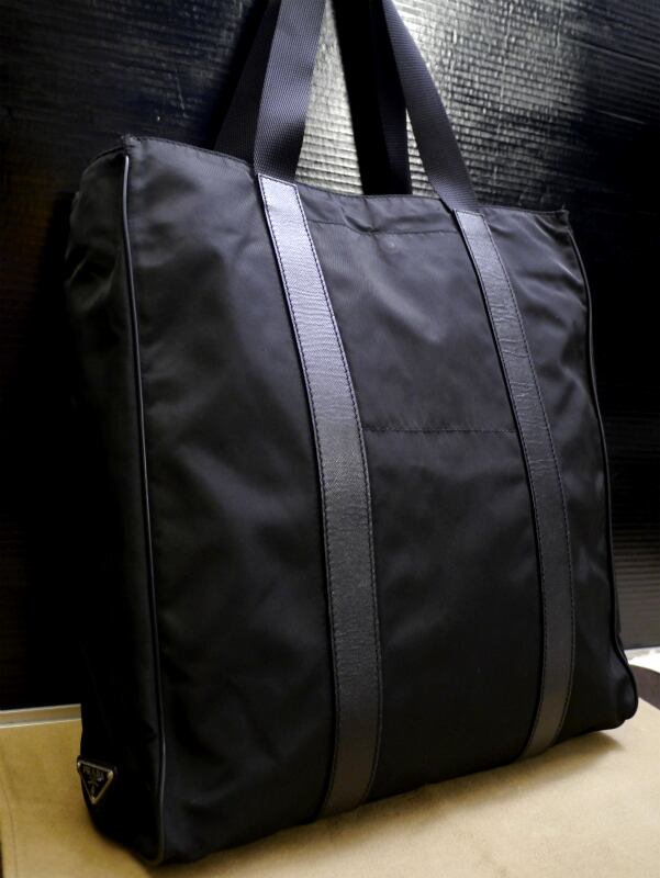 11万◆PRADA プラダ ユニセックス A4対応 ビジネス可 ナイロンxレザー 縦型 トート バッグ 黒◆ 珍しい縦型トートは通勤・通学にも大活躍♪