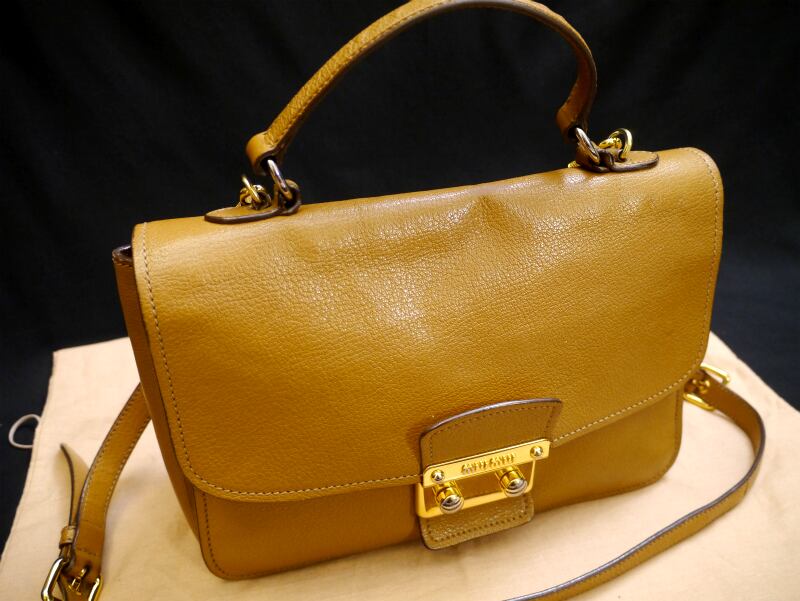 美品★miumiu ミュウミュウ MADRAS マドラス ハンド・ショルダー2way レザー バッグ 茶★ レトロクラシックな雰囲気が可愛らしい人気モデル