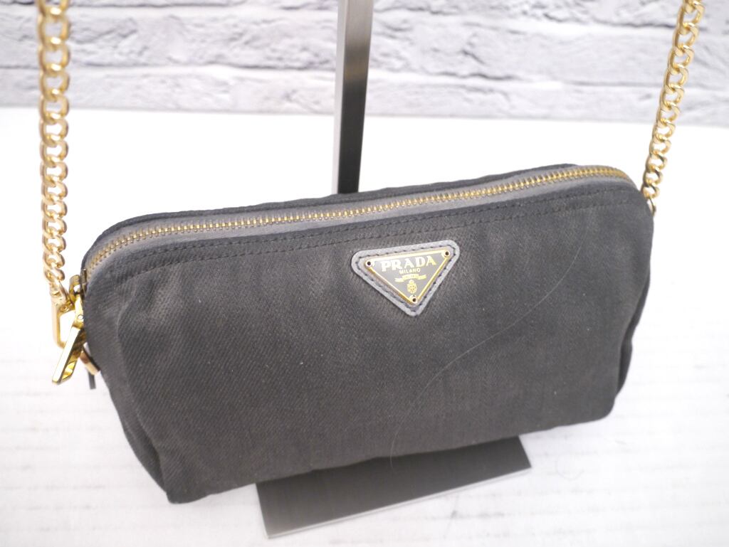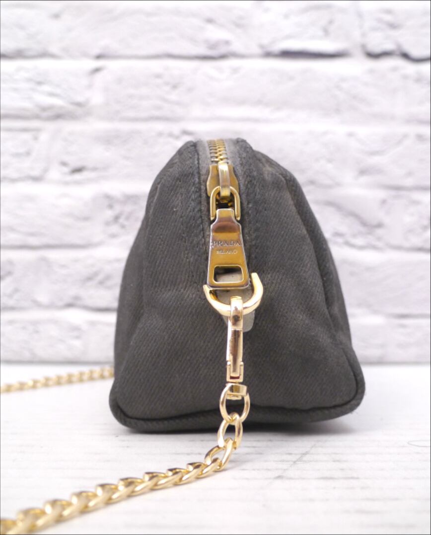 PRADAらしい上品なグレーのキャンバス地にゴールドの三角プレートやチェーンストラップがアクセントになったシンプルなデザインで、コーデのワンポイントとしてカジュアルにもシックにも合わせやすいアイテムです。