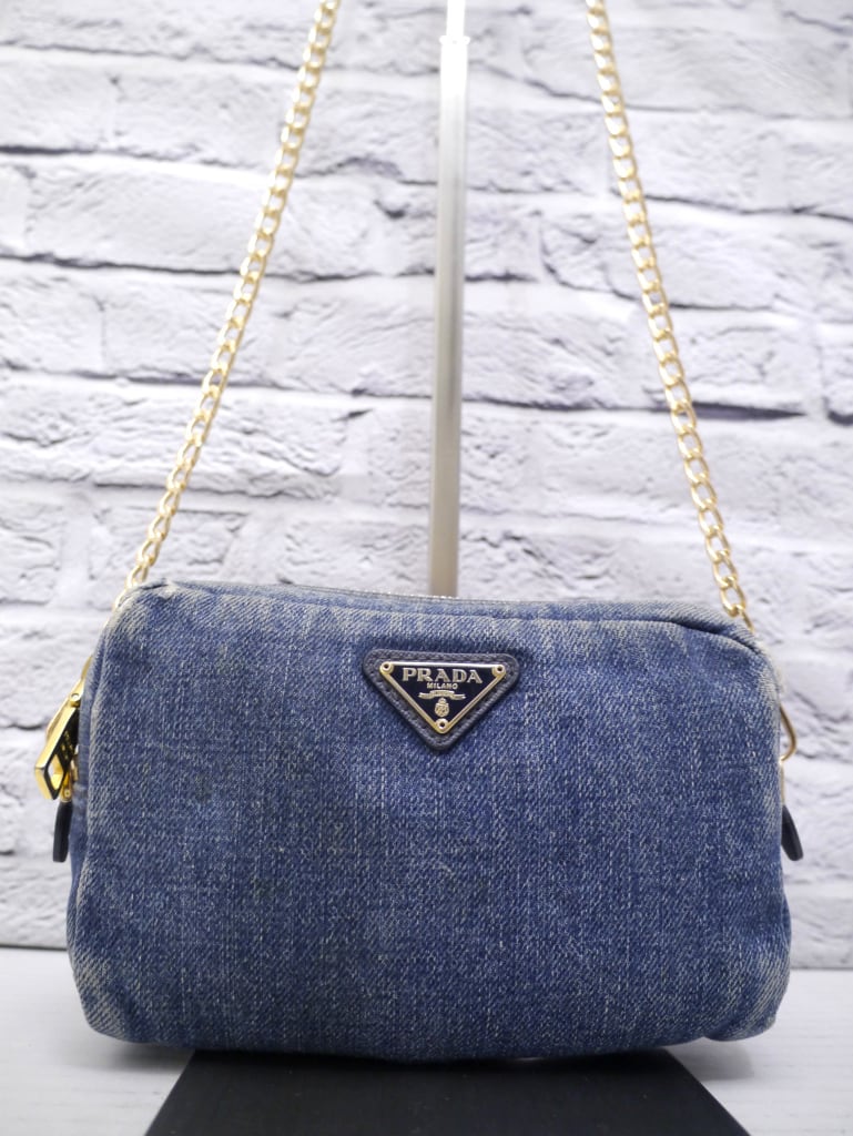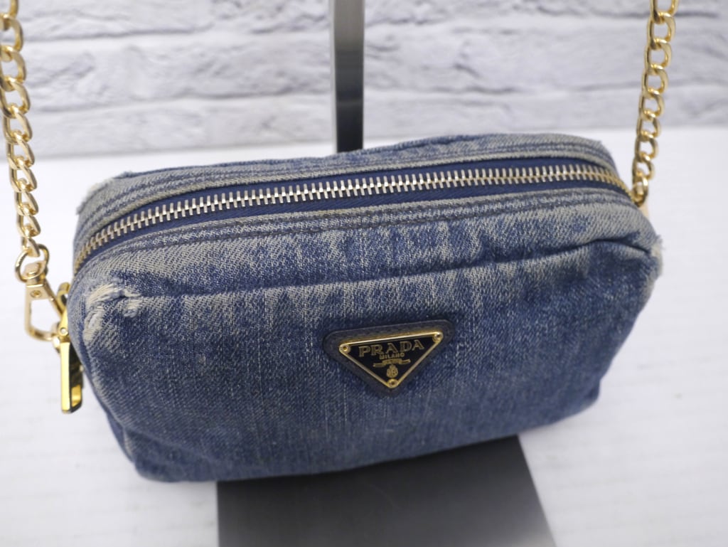 ◆PRADA プラダ CANAPA カナパ クロスボディ チェーンストラップ デニム ミニ ショルダー バッグ カメラ バッグ ポーチ 青x金◆ レアモデル