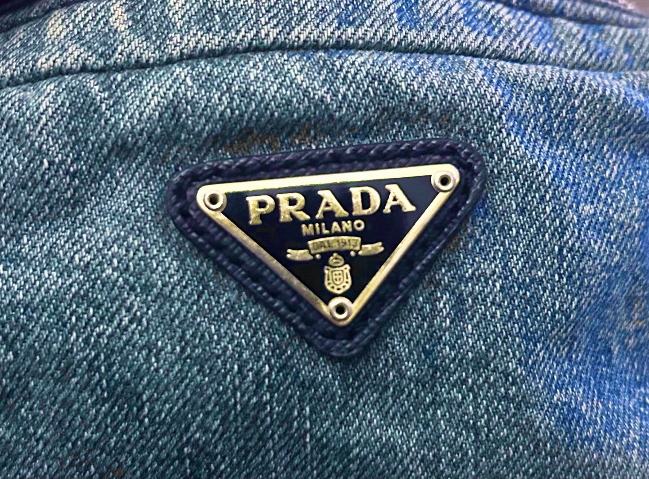 ◆ PRADA プラダ CANAPA カナパ クロスボディ チェーンストラップ ダメージ加工 デニム ショルダー カメラ バッグ ポーチ ポシェット 青x金
