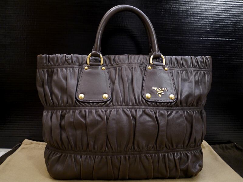 美品◆PRADA プラダ A4対応 ビジネス可 ギャザーデザイン レザー トートハンド バッグ 濃茶◆ 使い勝手の良いオールレザーのトートモデル♪