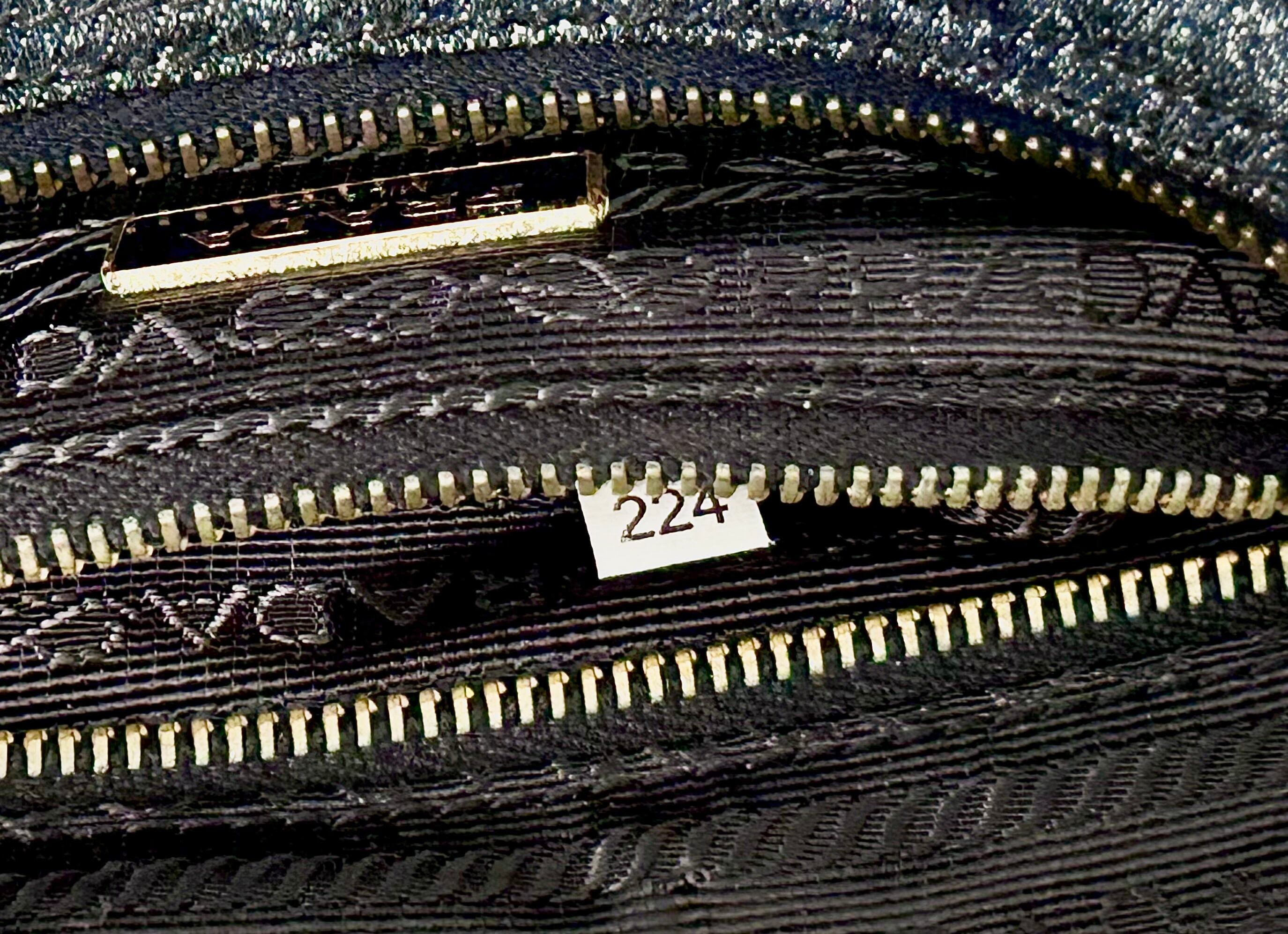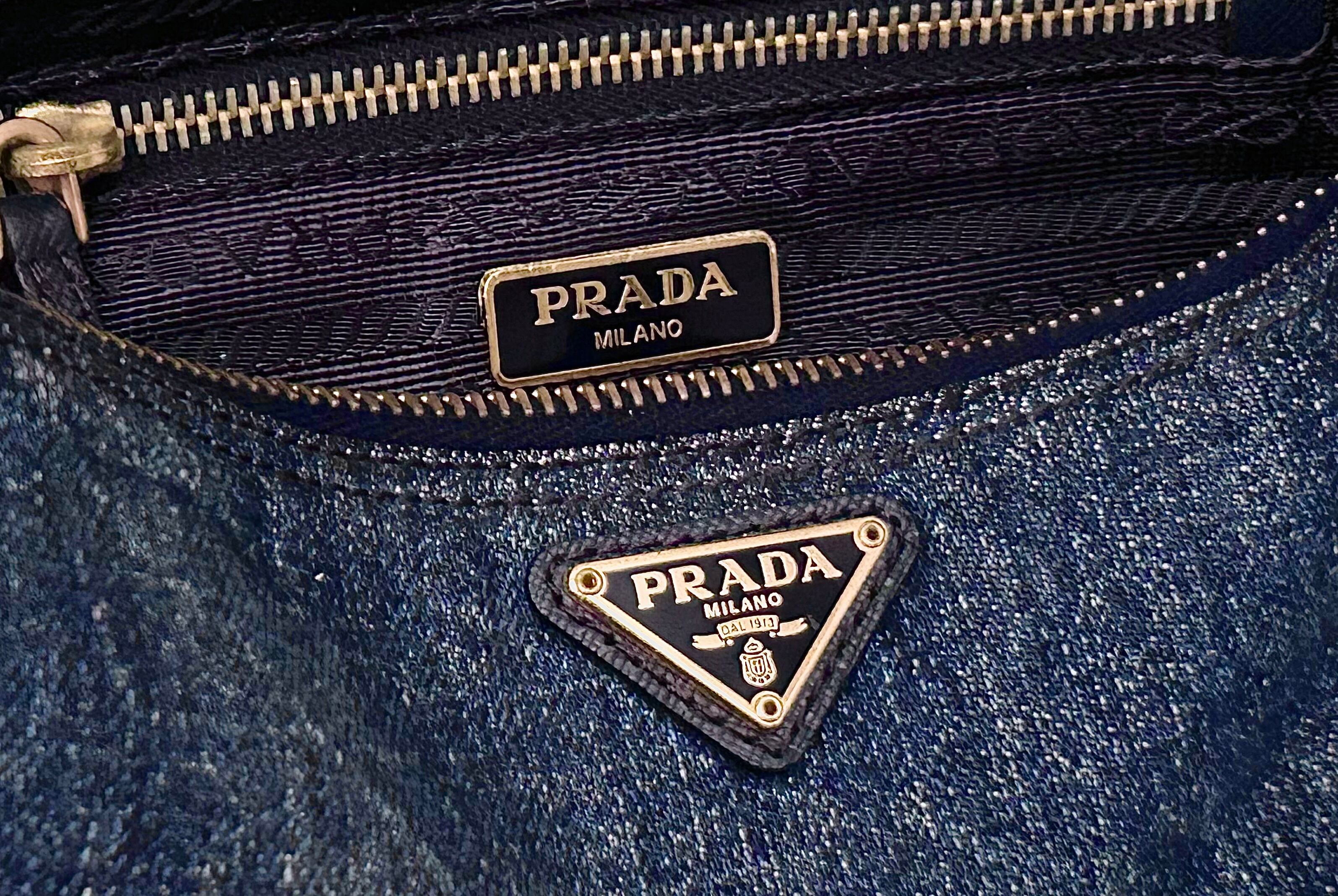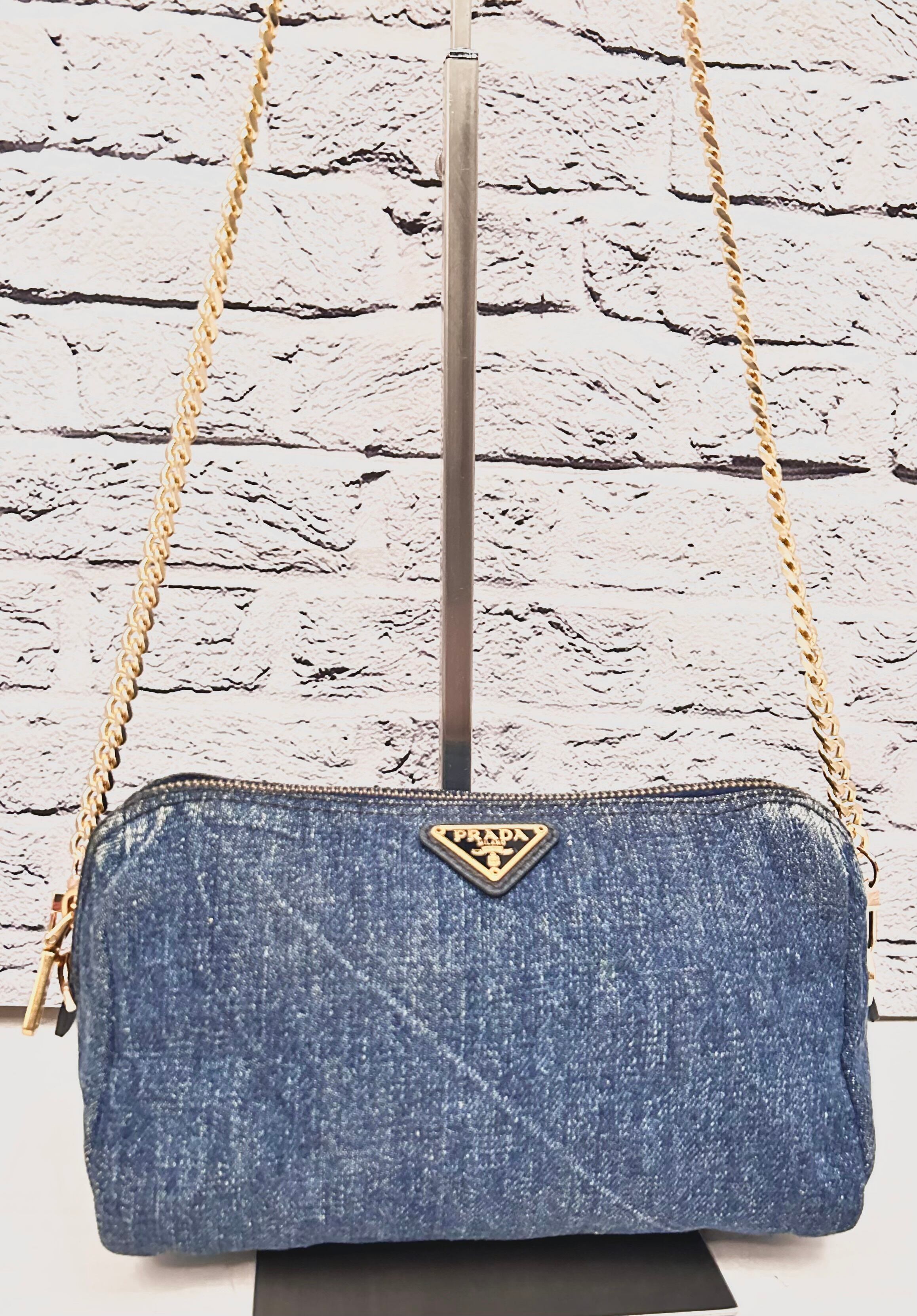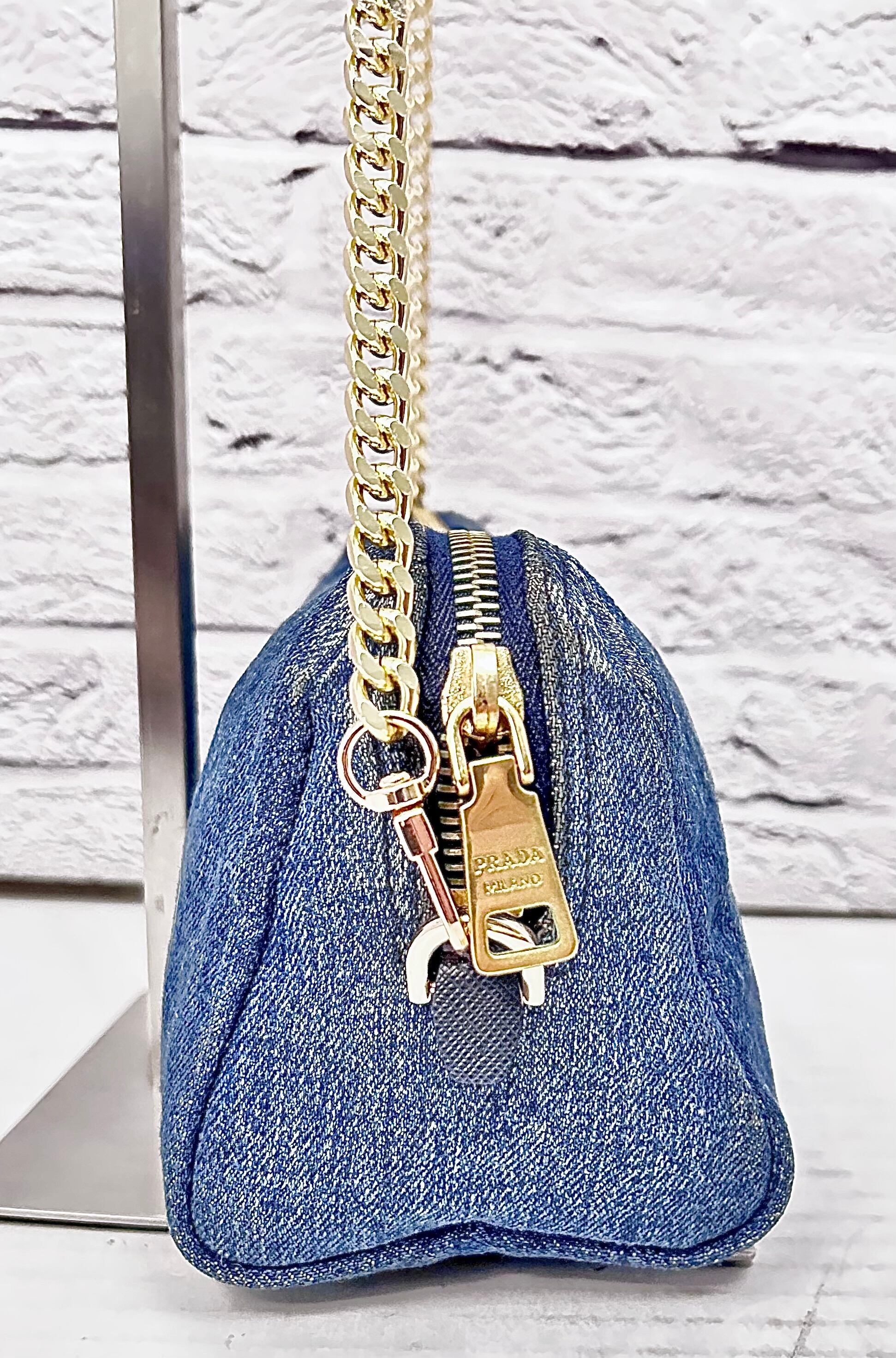 PRADAらしい上質なデニムのインディゴブルーにゴールドのトライアングルプレートやチェーンストラップがアクセントになったデザインで、コーデのワンポイントとしてカジュアルにもシックにも合わせやすいアイテムです。