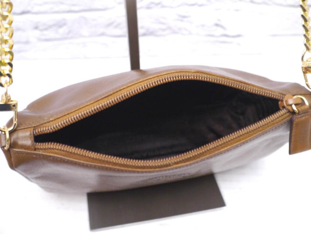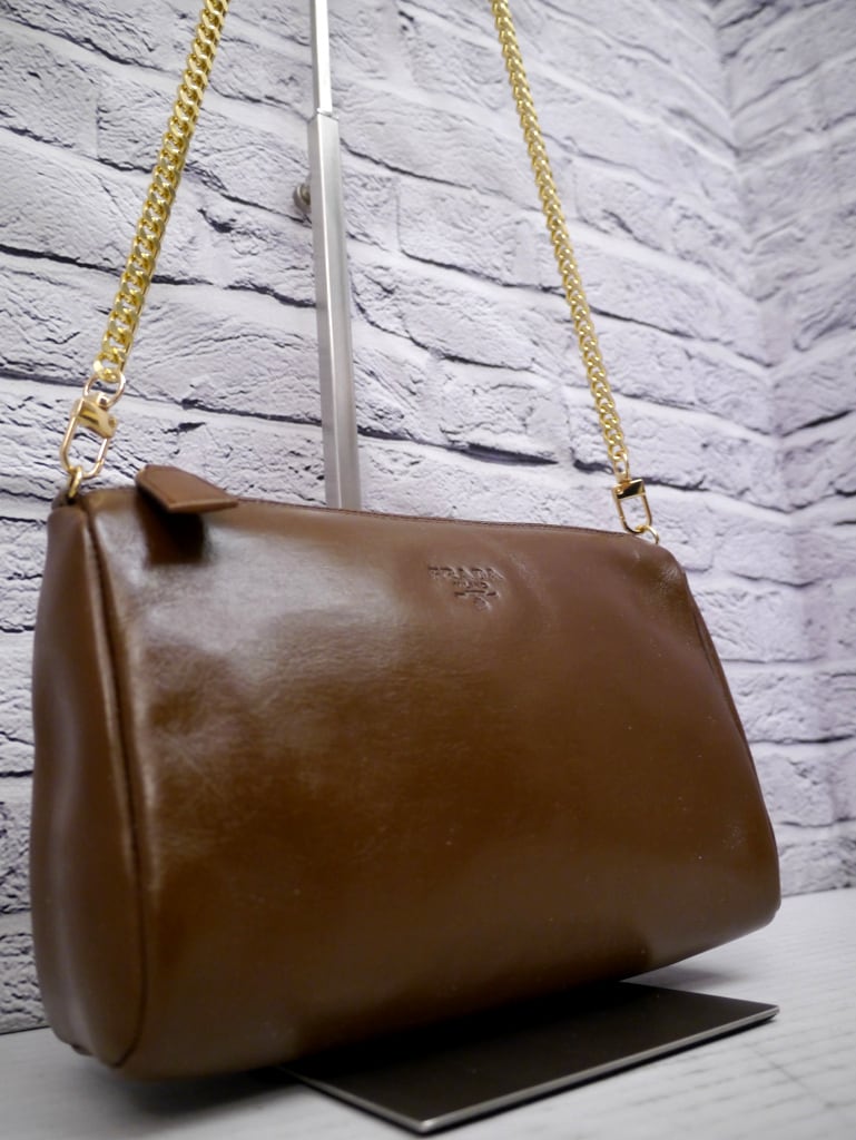 VINTAGE◆ PRADA プラダ VITELLO SHINE レザー チェーンストラップ クロスボディ ショルダー カメラ バッグ ポーチ ポシェット 茶x金◆