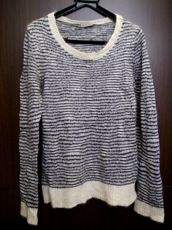 柔らかなモヘヤ混のニットで合わせやすいモノトーンのボーダー柄なので夏場以外は着回しに重宝します。