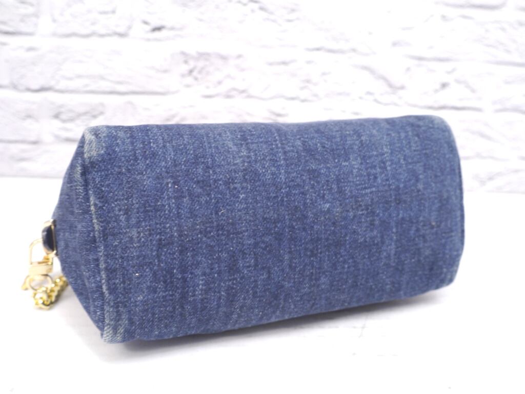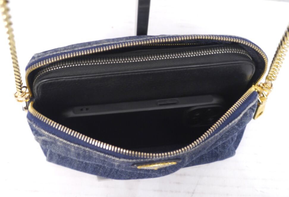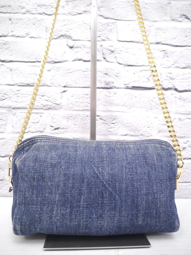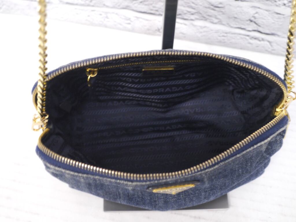 PRADAらしい上質なデニムのインディゴブルーにゴールドのトライアングルプレートやチェーンストラップがアクセントになったデザインで、コーデのワンポイントとしてカジュアルにもシックにも合わせやすいアイテムです。