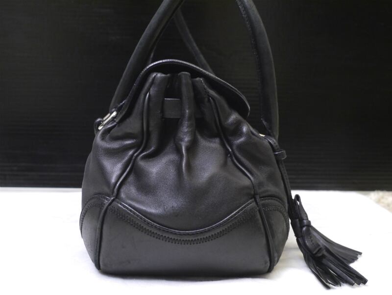 レア◆PRADA プラダ フリンジチャームデザイン ナッパレザー ミニボストン型 トート バッグ 黒x銀◆ 肩掛けも可能なロングハンドルが便利♪