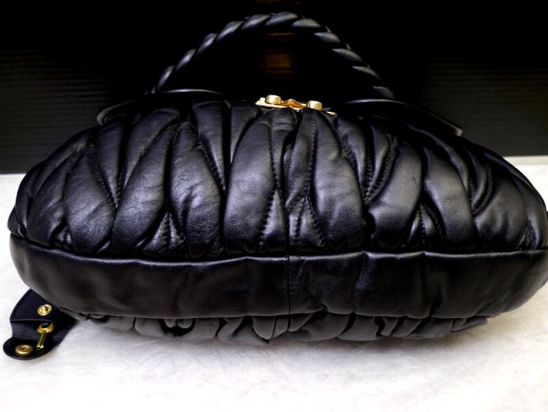 美品◆miumiu ミュウミュウ MATELASSE マトラッセ ギャザーデザイン レザートート バッグ 黒◆ 独特なギャザーがmiumiuらしい定番モデル♪