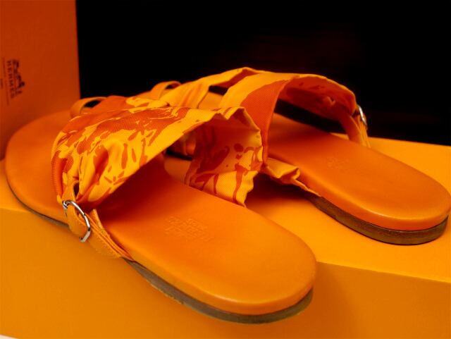 HERMES(エルメス) スカーフデザイン ナイロンxレザー フラット トング サンダル オレンジです。
