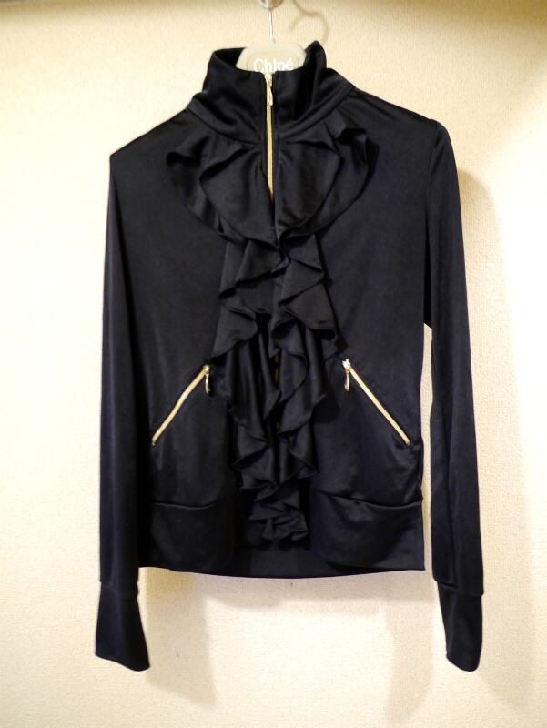 独特のボリューミーなフリルデザインに、光沢のあるツルツルとした肌触りの良い素材感とゴールドのジップが特徴の珍しいアイテムです。