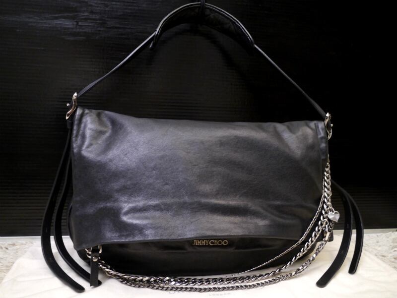 美品20万★JIMMY CHOO ジミーチュウ バイカーチェーン レザー サッチェル トート バッグ 黒★ ユニセックス仕様の大人気なバイカーライン♪