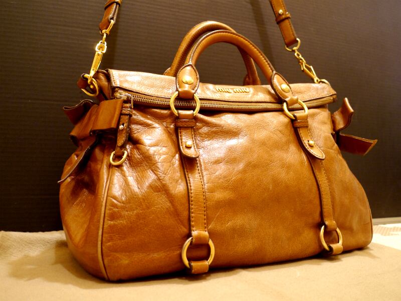 上品なブラウンのレザーにゴールドの【miumiu】ロゴやサイドのリボンがさりげなく主張し、とても可愛らしいデザインです。