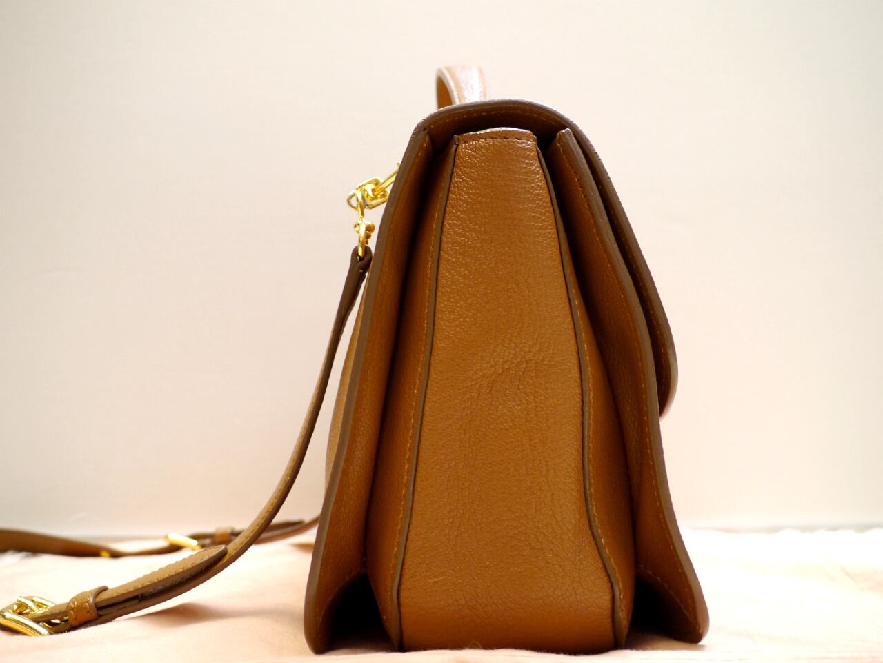 合わせやすいブラウンのレザーにゴールドの【miumiu】ロゴや金具がさりげなくが主張し、シンプルで合わせやすいのでシーンを問わずに大活躍するアイテムです。