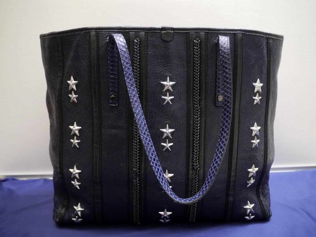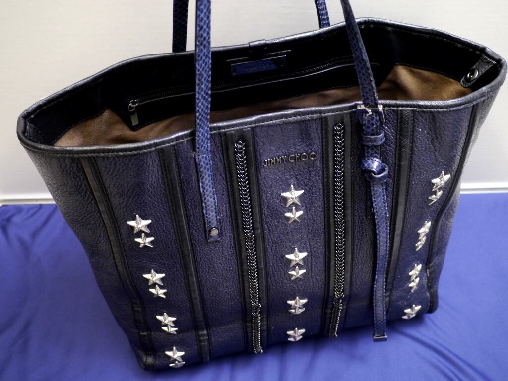 レア美品★JIMMY CHOO ジミーチュウ SASHA M A4対応 男女可 ☆スタッズ チェーン パイソン切替 レザー トート バッグ M 紺x黒★ 希少モデル