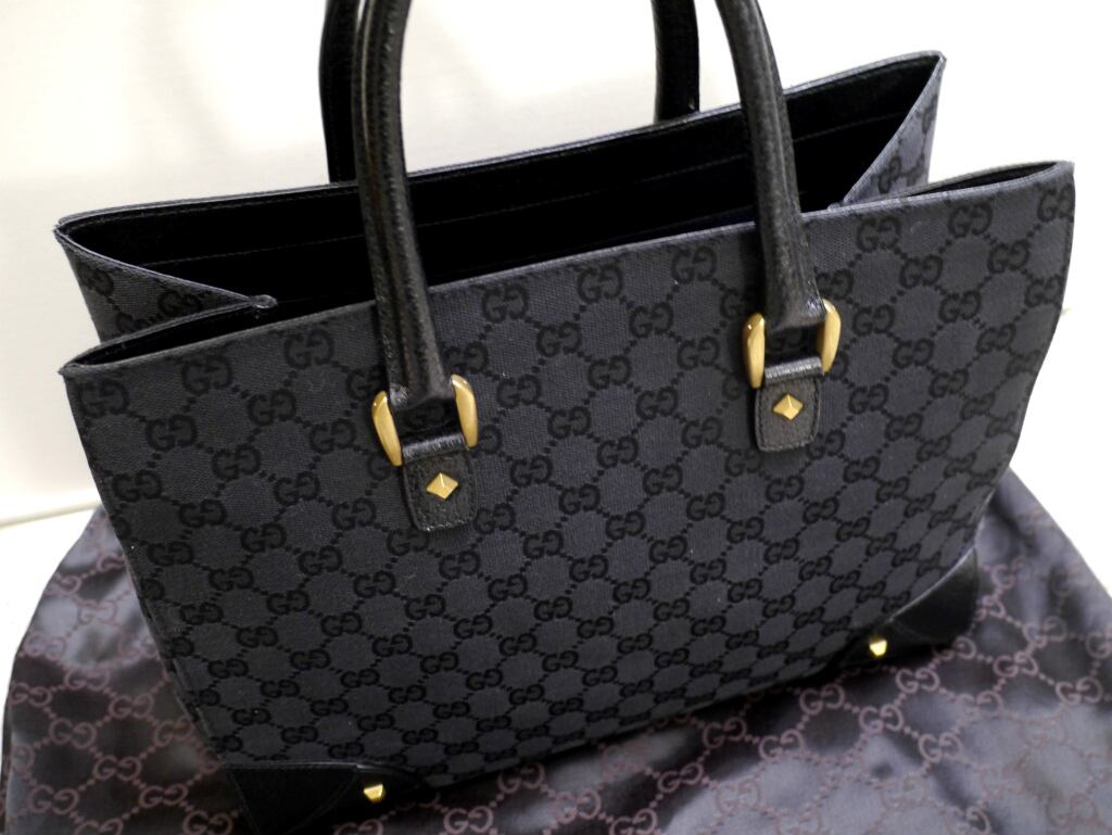美品16万◆GUCCI グッチ GG柄 A4対応 ビジネス可 男女可 キャンバスxレザー トート バッグ 黒◆ スタッズが主張するスタイリッシュなモデル