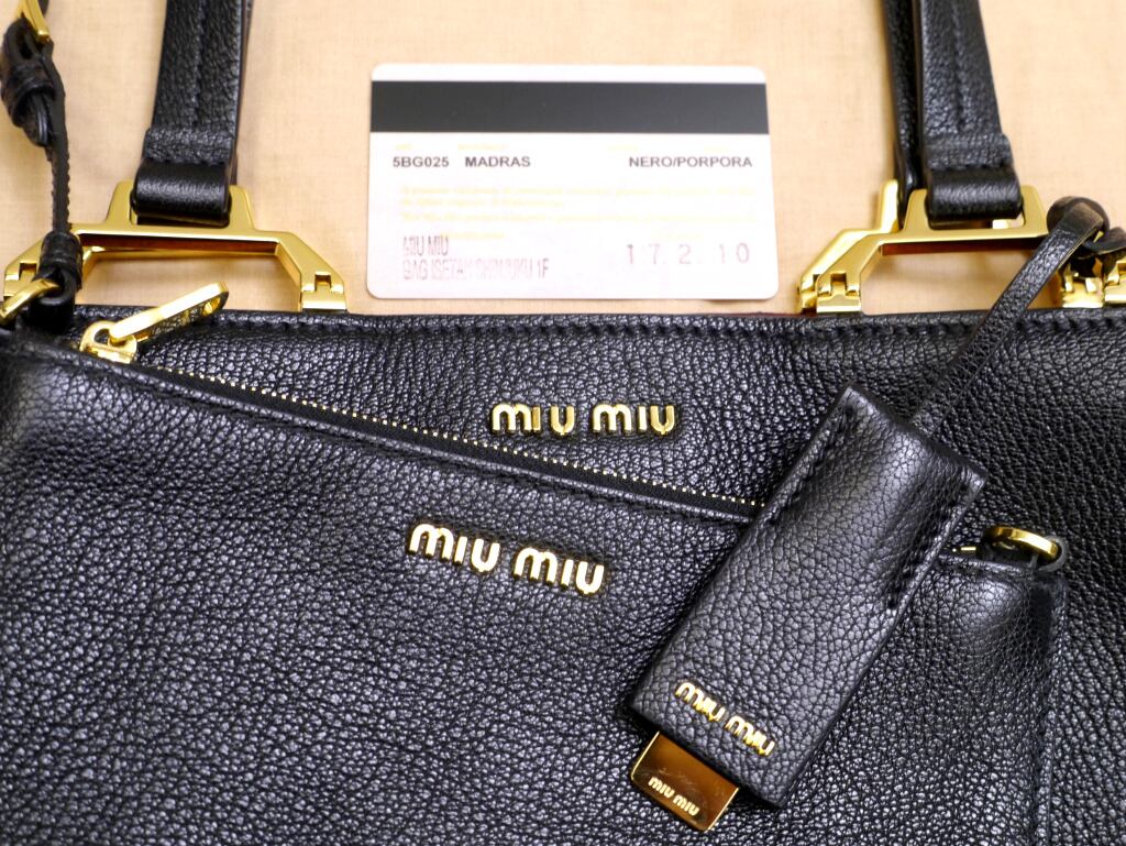 2017美品★miumiu ミュウミュウ MADRAS マドラス A4対応 ビジネス可 レザー トート バッグ 黒★ クラシックな雰囲気のポーチ付き定番トート