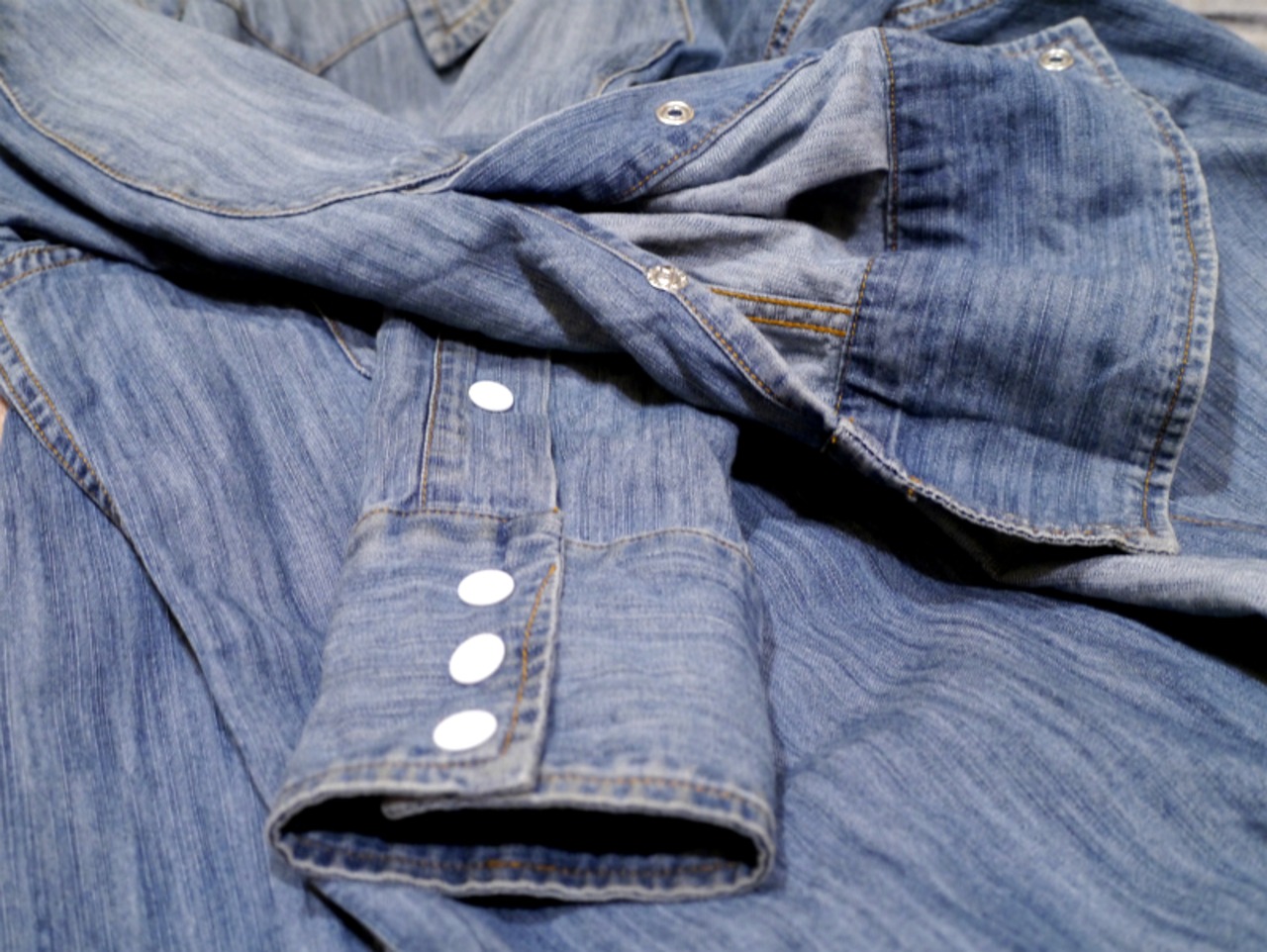 シンプルなデニムシャツにダメージ加工を施し、白のボタンやお得意のエルボーパッチでさりげなく個性を主張したマルジェラらしいデザインです。