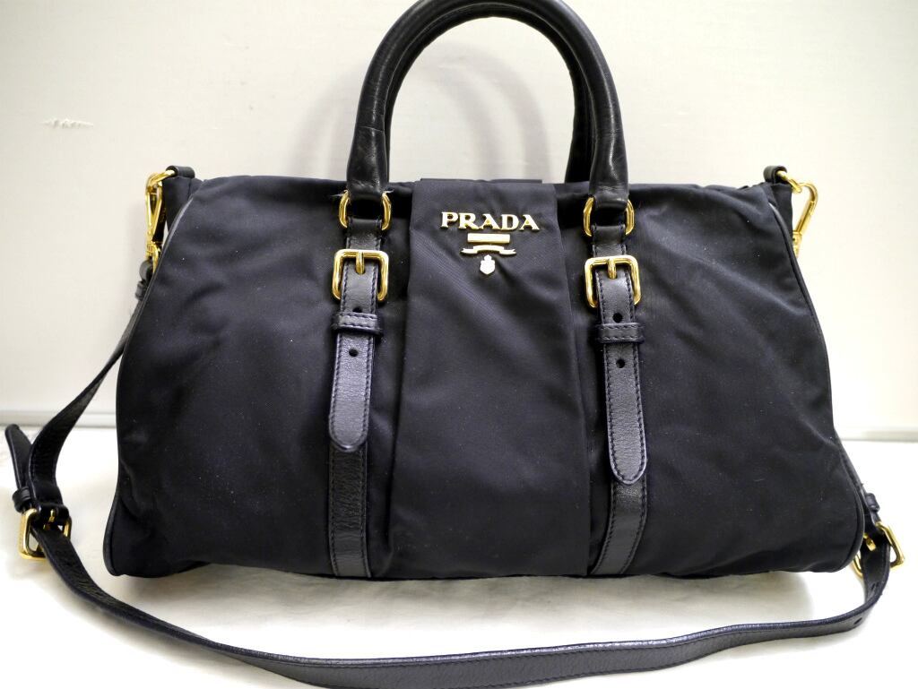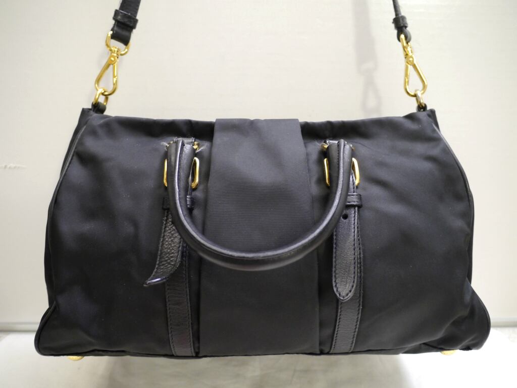 PRADA(プラダ) ゴールドロゴ ギャザーデザイン ナイロンxレザー切替 ハンドショルダー2way トートバッグです。