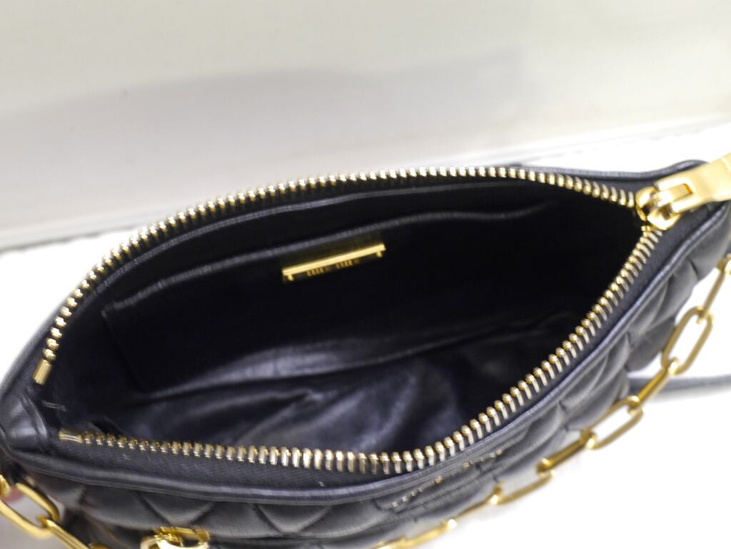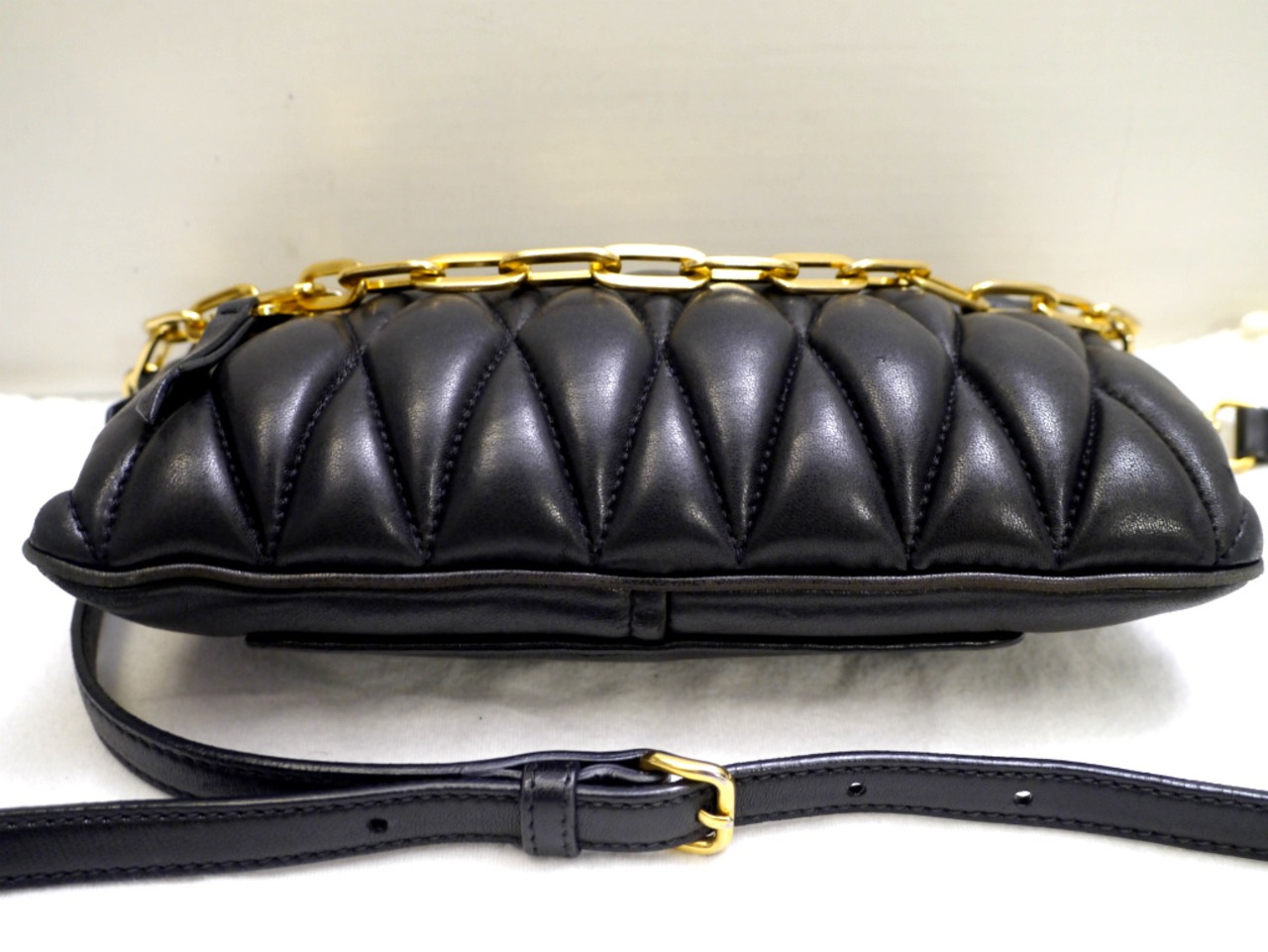 独特なマテラッセステッチにゴールドの【miu miu】ロゴや金具がさりげなく主張し、合わせやすいのでシーンを問わずに大活躍するアイテムです。