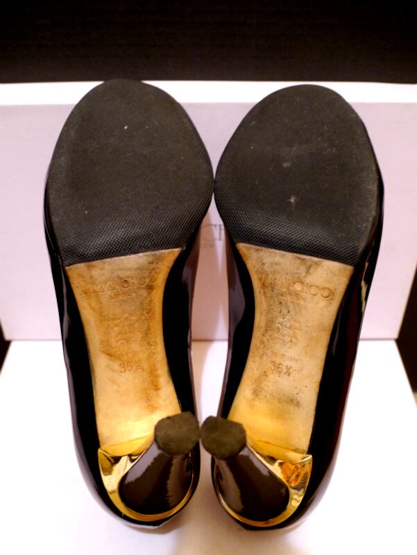 奇抜なデザインの印象が強いジミーチュウですが、こちらは一見シンプルなブラックのパテントレザーにゴールドのヒールがさりげなく主張し、幅広い年代の方に取り入れやすいアイテムだと思います。