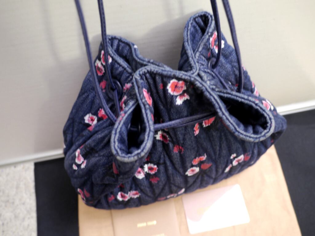 miu miu(ミュウミュウ) 花柄 フラワープリント デニムxレザー 巾着型 ハンドショルダー トート バッグです。