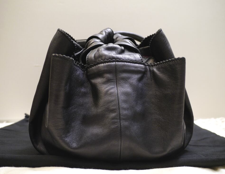 巾着バッグのような独特な可愛らしい形状が人気のモデルで、カラーバリエーションが豊富なラインの中でこちらは定番のブラックで合わせやすく、普段使いにも重宝します。