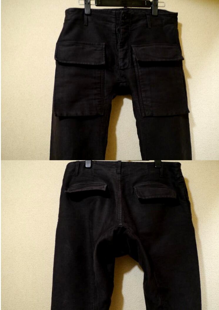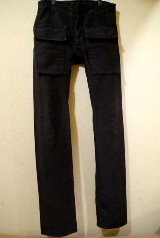 リックのカーゴと言えばサルエルが有名ですが、こちらはシルエットとしてはシンプルな細身のストレートラインで、ダークシャドウのデニムやディオールオムのボトムスのようにレングスが非常に長く、裾にクッションを作って着用するイメージです。
