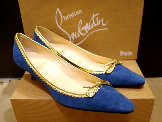 奇抜なデザインの印象が強いルブタンですが、こちらは発色の綺麗なグリーンがかったブルーのスエード素材に、ゴールドのレースをあしらったとても上品なアイテムで、なかなか見かけない希少なモデルだと思います。