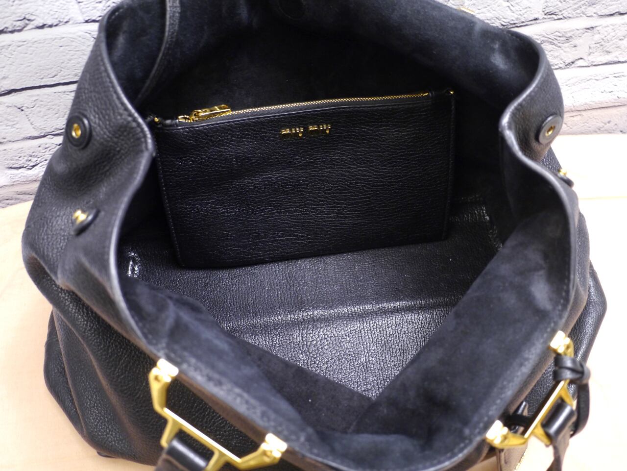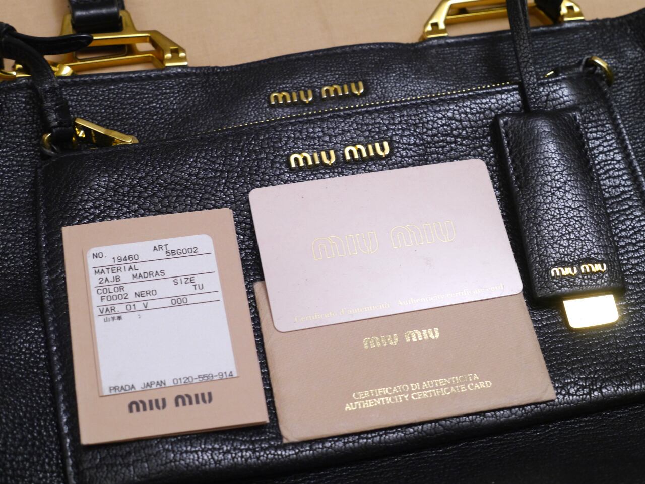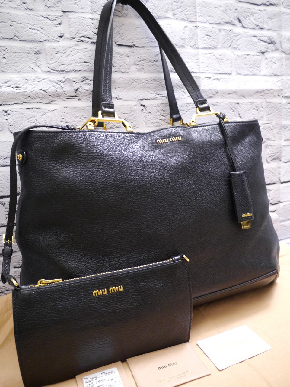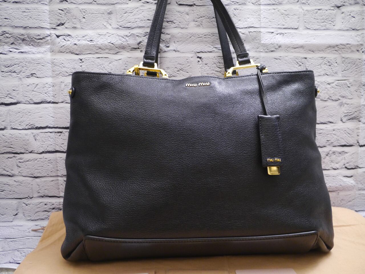 美品★miumiu ミュウミュウ MADRAS マドラス A4対応 ビジネス可 レザー トート バッグ 黒★ クラシックな雰囲気のポーチ付き定番トート型♪