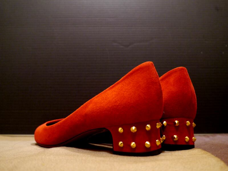 赤のスエードに丸みを帯びたトゥがとても可愛らしい印象ですが、相反するようなヒールのゴールドのスタッズがスパイスとなるのでコーデのポイントとしてご活用下さい。