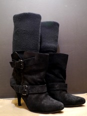 一見シンプルなショートブーツですが、靴下のようなロングニットがドッキングされた仕様で、ニットの使い方次第で変わった表情を見せる面白いデザインで、足元のポイント作りにはもってこいだと思います。