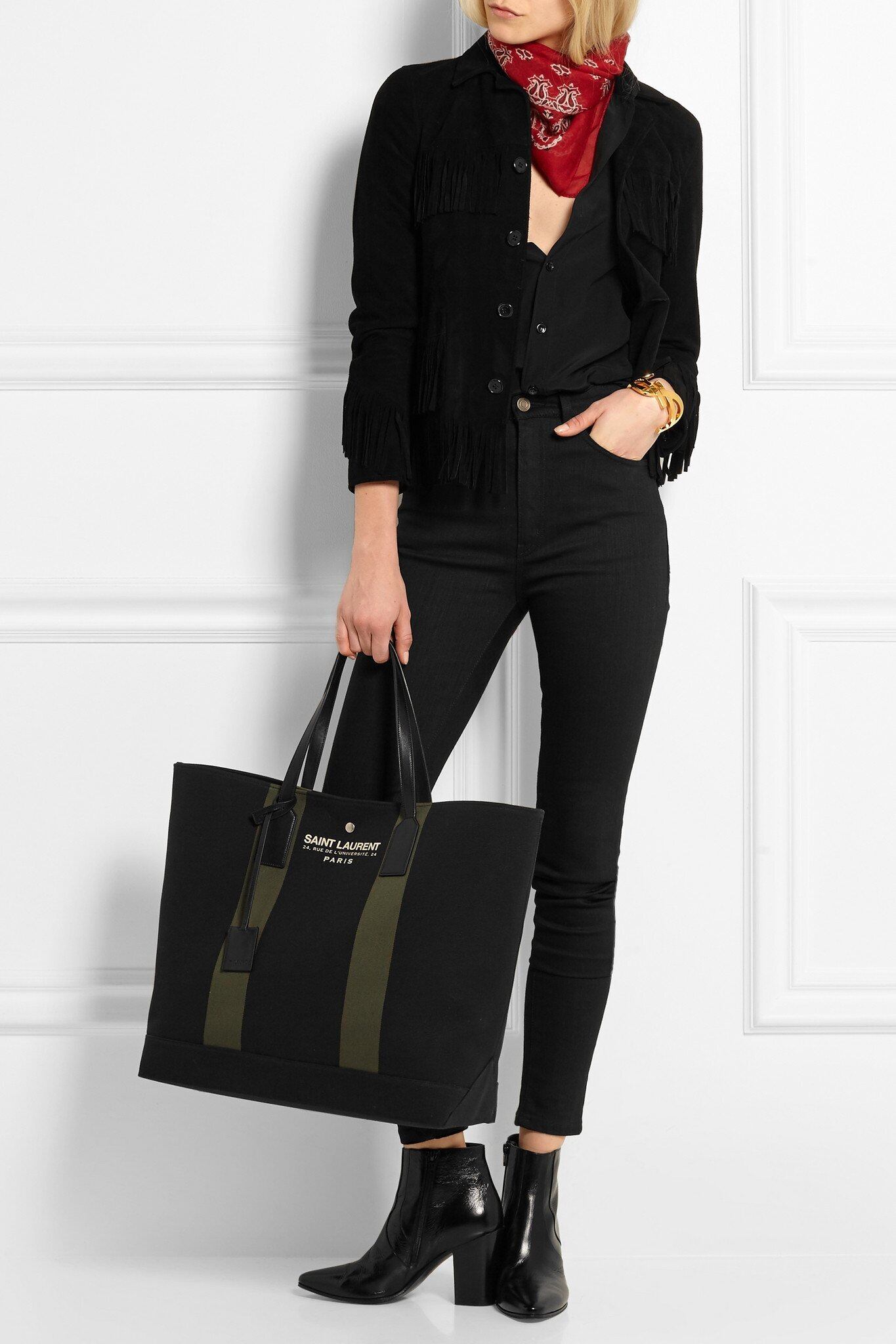 ◆SAINTLAURENT サンローラン ビーチショッピング A3対応 男女可 キャンバスxレザー トート バッグ 黒◆ ロゴが主張する大容量の定番モデル