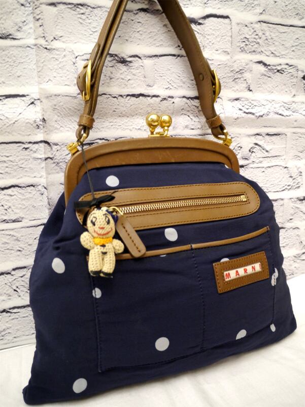 レア美品◆MARNI マルニ がま口デザイン ドット柄 キャンバスxレザー ハンド バッグ 紺◆ 個性的ながま口とドットが主張するレアモデル♪
