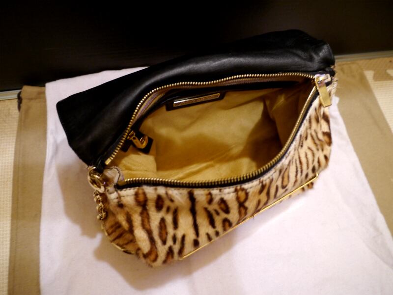 シンプルなものから奇抜なデザインまで幅広いラインナップが魅力のジミーチュウのバッグ類ですが、毛足の長いフワフワのハラコ(ファー)レオパード柄にゴールドのチェーンが存在感を放ち、良い意味でジミーチュウらしさ満点のアイテムです。