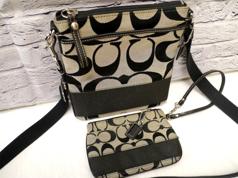 美品◆COACH コーチ シグネチャーデザイン キャンバスxレザー クロスボディ ミニ ショルダー バッグ◆ 附属のポーチも便利な秀逸モデル♪
