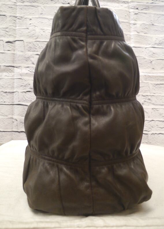 ◆PRADA プラダ A4対応 ビジネス可 ギャザーデザイン レザー トート ハンド バッグ 茶◆ 使い勝手の良いオールレザーの万能トートモデル♪