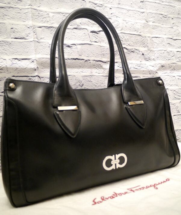 美品◆Salvatore Ferragamo フェラガモ ダブルガンチーニ サフィアーノ レザー トート ハンド バッグ 黒◆ 使い勝手の良いトート型の定番♪